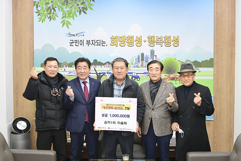 [강원사회복지신문 홍기한 기자]=횡성군 읍하1리 마을회는 지난 1월 5일 14시40분 군수집무실을 방문하여 성금 100만원을 '횡성행복나눔성금'에 전달하였다. 이날 전달식에는 횡성군수 김명기와 읍하1리 이장 민영기 외 2명이 참석하였다. 전달된 성금은 관내 저소득층 및 복지사각지대에 있는 어려운 이웃을 돕는데 뜻깊게 ...