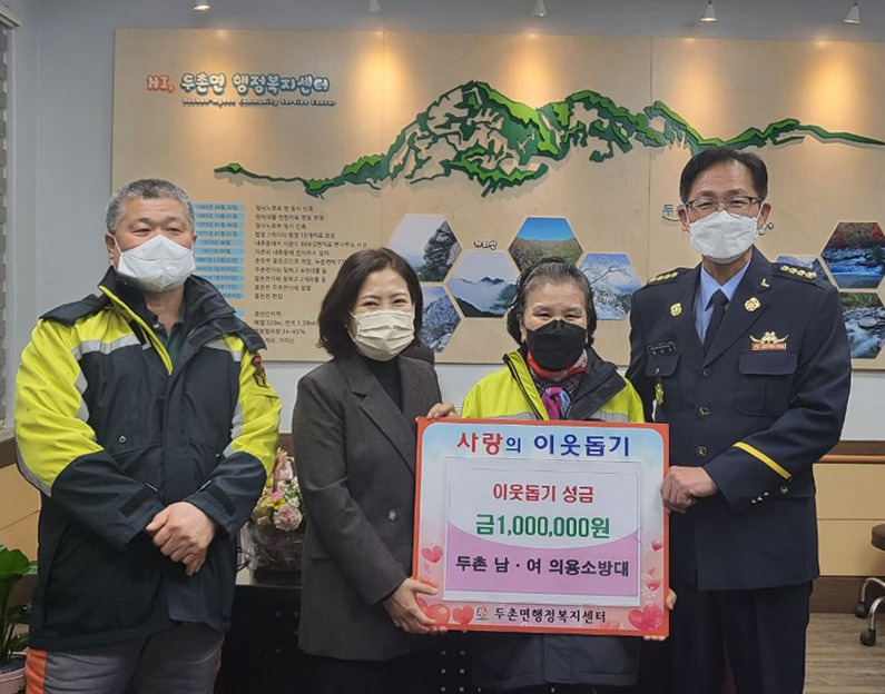 [강원사회복지신문 김도연 기자]=홍천군 두촌면 의용소방대(남대장 용연식, 여대장 권후녀)는 계묘년 새해를 맞이하여 지난 1월 4일 두촌면행정복지센터를 방문, 어려운 이웃돕기 성금 100만원을 지정 기탁했다. 이날 전달된 성금은 관내 긴급지원이 필요한 저소득 가정에 우선 지원될 예정이다. 김경숙 두촌면장은 "후원금을...