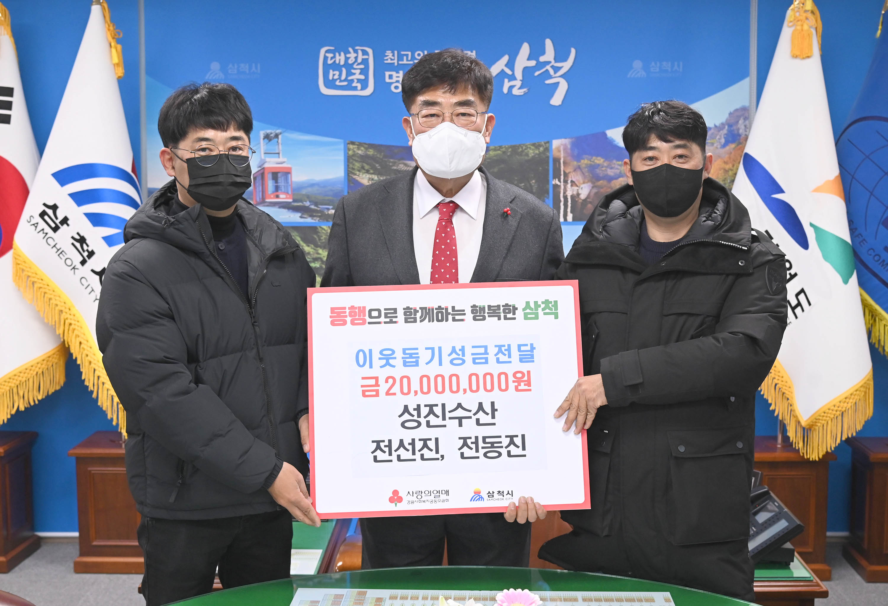 [강원사회복지신문 이정환 기자]=성진수산(대표 전선진)은 지난 1월 4일 삼척시청을 방문하여 희망2023나눔캠페인 성금으로 2천만 원을 기탁했다. 성진수산은 지난해에도 희망2022나눔캠페인 성금으로 2천만 원을 기탁해 훈훈함을 전했다.