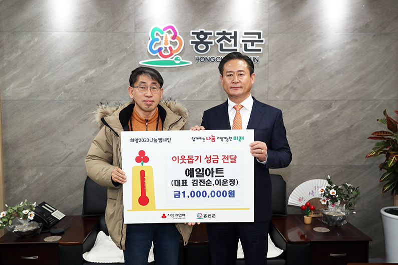[강원사회복지신문 홍기한 기자]=예일아트(대표 김진순, 이운정)는 지난 1월 4일 홍천군청을 방문해 '희망2023나눔캠페인' 성금 100만원을 기탁했다. 김진순 대표는 "작은 정성이지만 어려운 이웃들에게 도움이 되길 바란다"고 말했다. 신영재 홍천군수는 "새해를 맞아 소외된 이웃들을 잊지 않고 따뜻한 온정의 마음을 나눠...