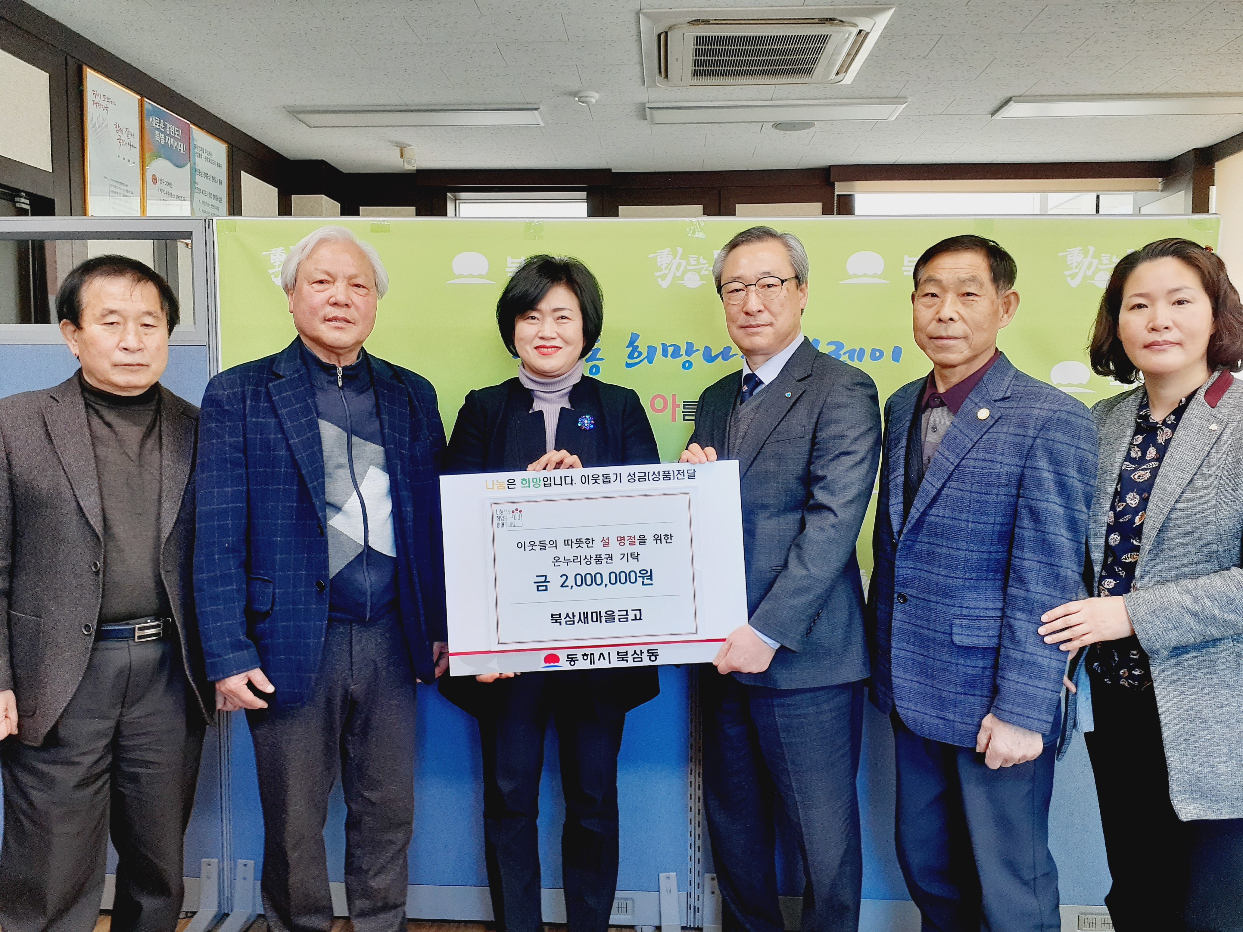 [강원사회복지신문 서은진 기자]=복지사각지대 대상자 및 저소득층 20명에게 전달예정 동해 북삼새마을금고(이사장 최돈승)는 지난 1월 3일 북삼동행정복지센터를 방문하여 이웃들의 따뜻한 설 명절을 위한 온누리상품권 200만원을 기탁했다. 북삼새마을금고는 매년 설 명절 온누리상품권 100만원을 기탁해 왔으며, 동절기에...