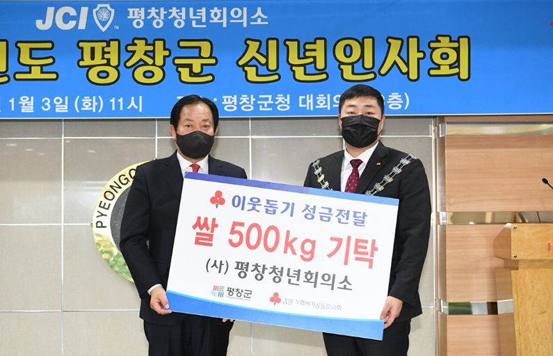 [강원사회복지신문 김종한 기자]=평창청년회의소(회장 임정민)는 지난 1월 3일 평창군청 대회의실에서 주요 내빈 및 관내 기관·사회단체장 등 100여 명이 참석한 가운데 '2023년 평창군 신년 인사회'를 개최하였으며, 신년 인사회를 기념하여 이웃돕기 성품으로 쌀 500kg을 기탁하였다.