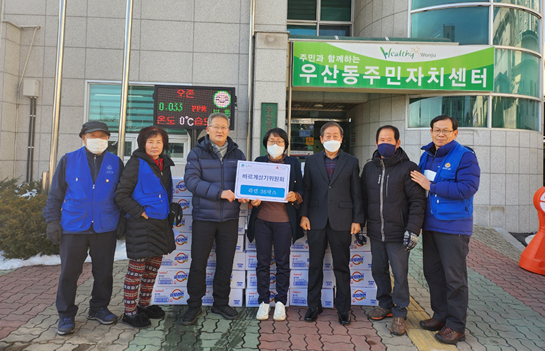[강원사회복지신문 서은진 기자]=원주시 우산동 바르게살기위원회(위원장 손영익)는 지난 12월 28일 연말을 맞아 저소득 가구를 위해 50여만원 상당의 라면 36박스를 원주시 우산동 행정복지센터(동장 박정희)에 전달했다. 바르게 살기 위원회는 매년 후원 활동을 이어가고 있으며, 후원한 물품은 관내 거주하는 취약계층 총...