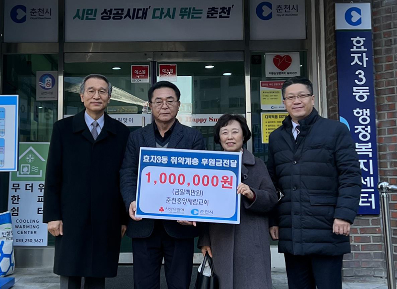 [강원사회복지신문 서은진 기자]=춘천중앙재림교회(담임목사:신양희)는 지난 12월 29일 춘천시 효자3동 관내 취약계층을 위한 후원금 100만원을 효자3동행정복지센터에 전달했다.