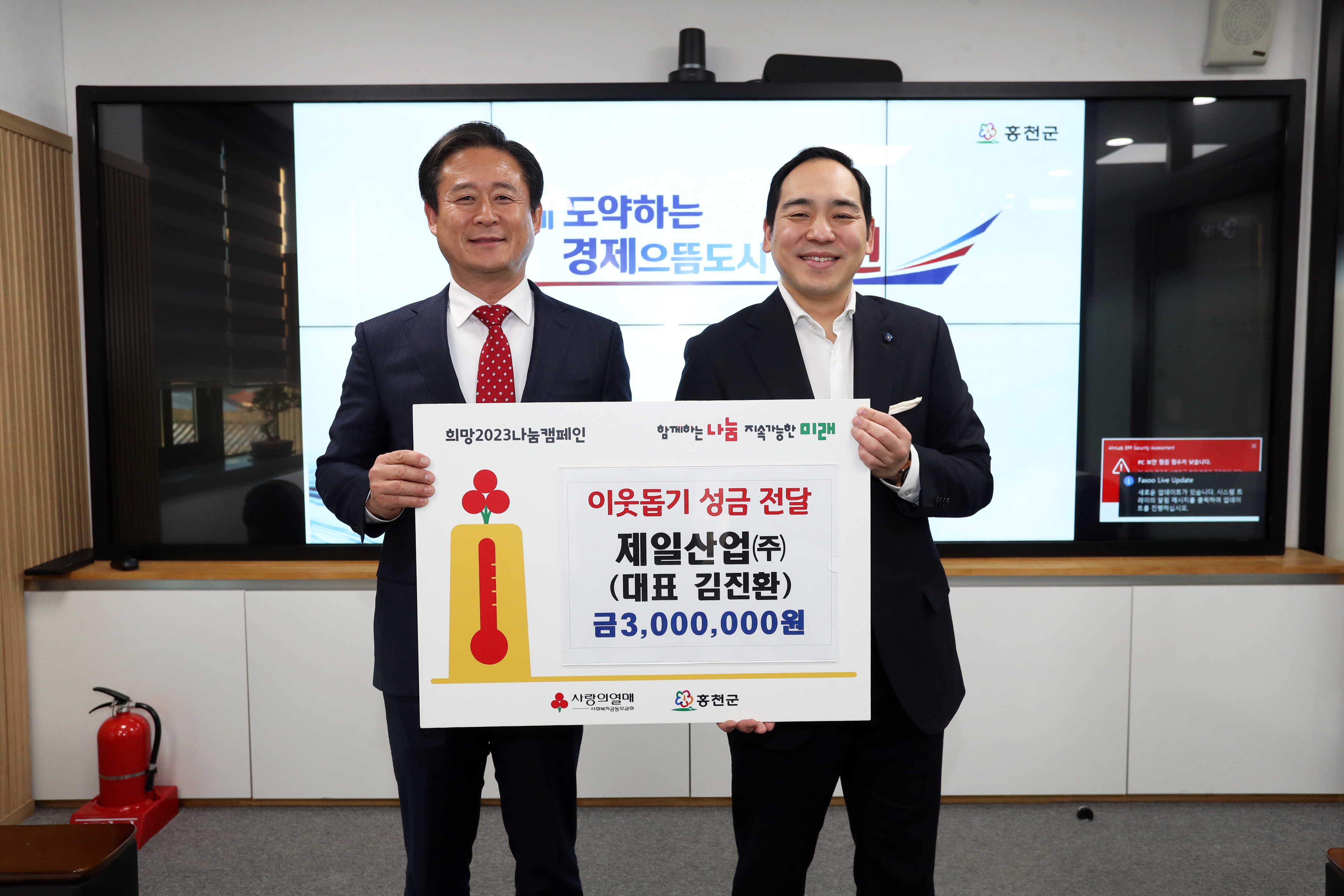 [강원사회복지신문 서은진 기자]=제일산업(주)(대표 김진환)은 지난 12월 29일 홍천군청을 방문해 '희망2023나눔캠페인' 성금 300만원을 기탁했다.