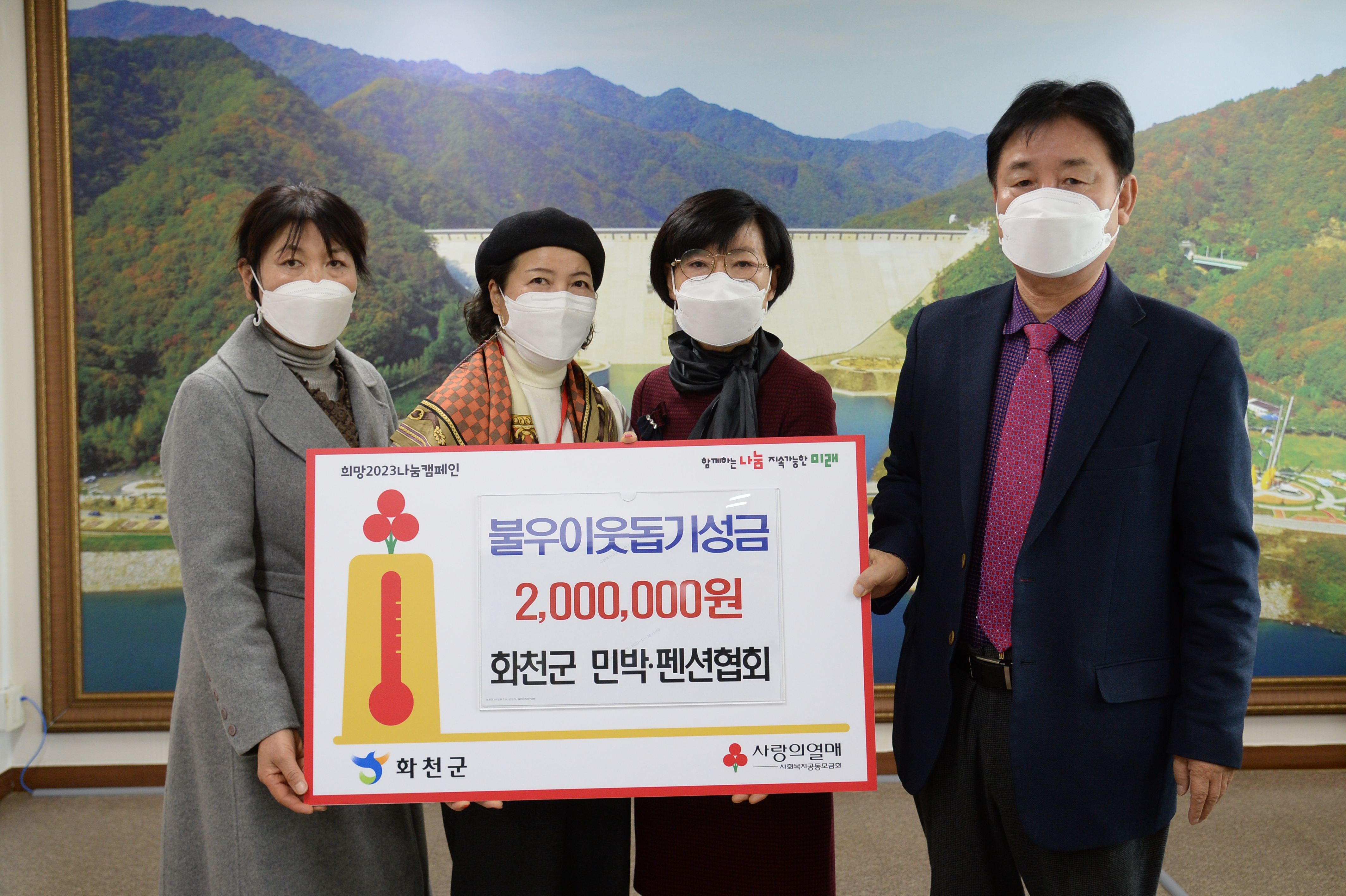 [강원사회복지신문 이정환 기자]=화천군 민박펜션협회(회장 정혜숙)는 지난 12월 29일 최문순 화천군수를 방문해 이웃돕기 성금 200만원을 기탁했다.