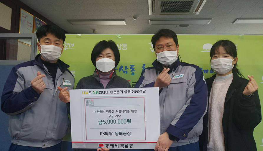 [강원사회복지신문 김종한 기자]=(주)DB메탈 동해공장(공장장 전상수)은 지난 12월 27일 동해시 북삼동행정복지센터를 방문해 이웃들의 따뜻한 겨울나기 후원금 500만원을 기탁하였다. 이번 후원금은 'DB김준기문화재단'의 사회복지사업 일환으로, 북삼동 복지사각지대 대상자 및 저소득계층이면서 한파에 취약한 대상자 25명...