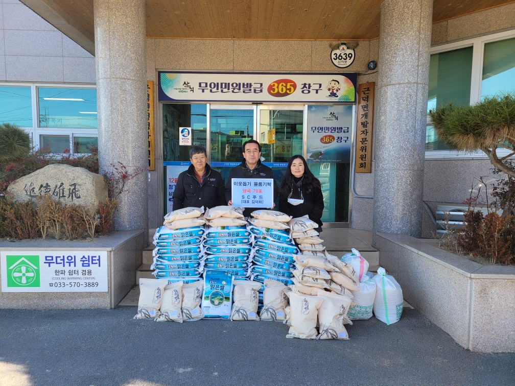 [강원사회복지신문 김도연 기자]=SC푸드(대표 김덕하)는 지난 12월 29일(목) 삼척시 근덕면행정복지센터를 방문하여 근덕면 관내 취약계층에게 전달해달라며 양곡 70포(10kg 30포, 5kg 40포)를 기탁하여 따뜻한 이웃사랑을 실천하였다.