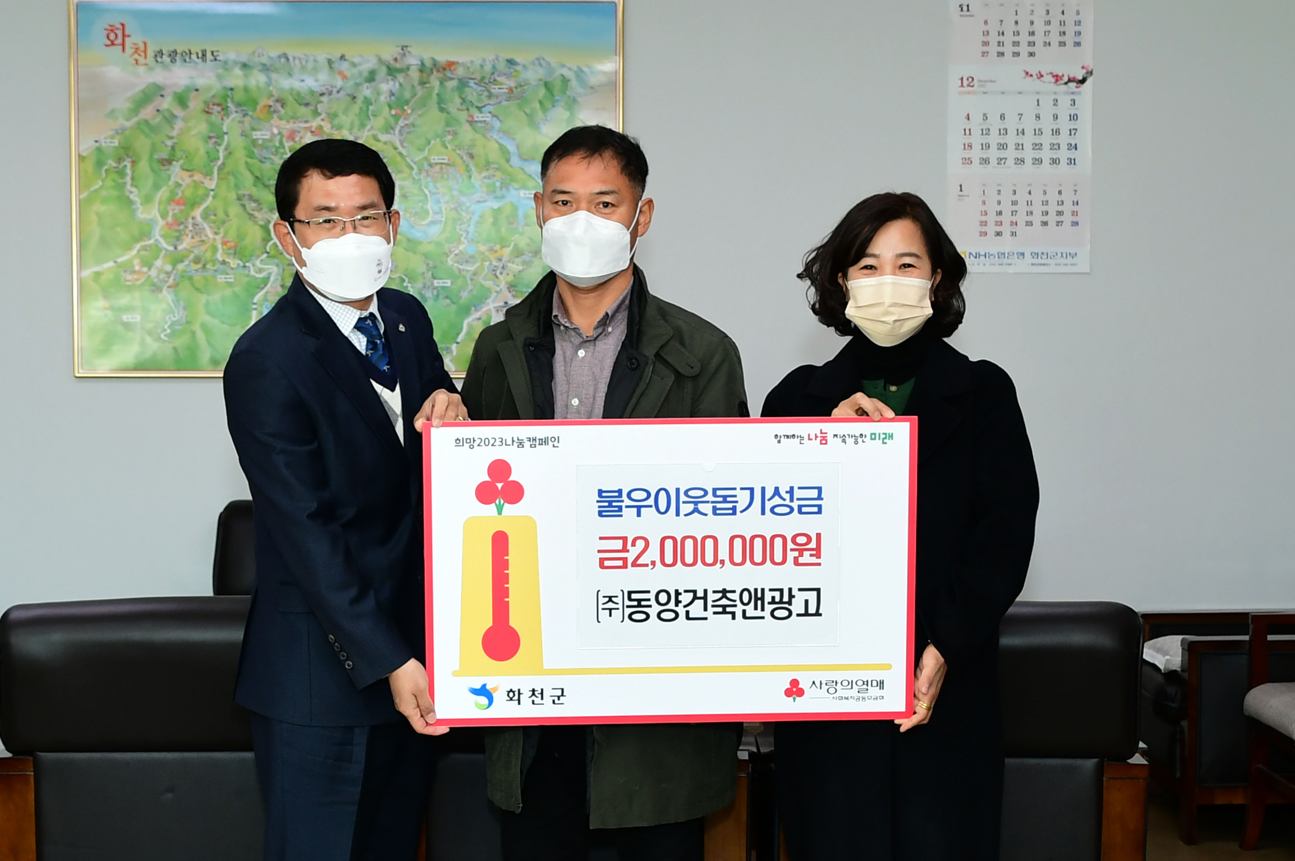 [강원사회복지신문 이정환 기자]=(주)동양건축&광고(대표:성미자)는 지난 12월 19일 최명수 화천부군수를 방문해 이웃돕기 성금 200만원을 기탁했다.