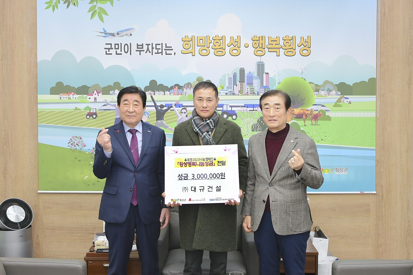 [강원사회복지신문 홍기한 기자]=(주)대규건설(대표 이상승)은 지난 12월 16일 14시 횡성군수집무실을 방문하여 성금 300만원을 '횡성행복나눔성금'에 기탁하였다.
