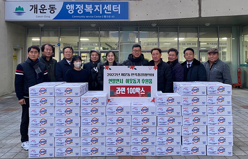 [강원사회복지신문 서은진 기자]=원주시 개운동 민족통일협의회(회장 이동원)는 지난 12월 19일 어려운 이웃에게 전해달라며 라면 100박스를 개운동 행정복지센터에 기탁했다. 이동원 회장은 "모두가 어려운 시기에 나눔에 동참할 수 있게 돼 기쁘다."라며, "작은 정성이지만 따뜻한 도움이 됐으면 좋겠다."라고 전했다.