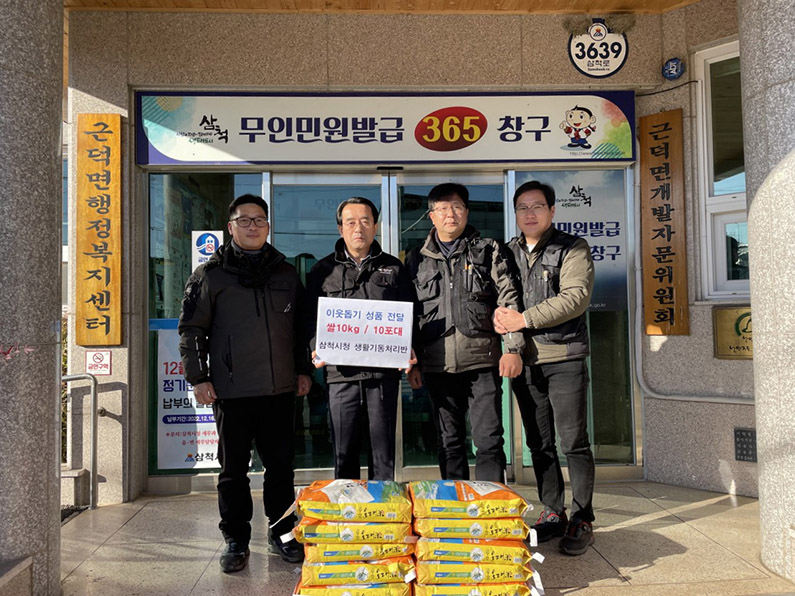 [강원사회복지신문 이정환 기자]=삼척시청 소속의 생활기동처리반 3명은 지난 12월 19일(월) 근덕면 행정복지센터를 방문하여 관내 어려운 이웃을 위한 후원물품(쌀 10kg 10포대)을 기탁하여 따뜻한 사랑과 나눔을 실천하였다.