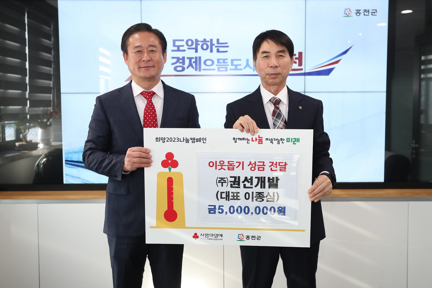 [강원사회복지신문 홍기한 기자]=(주)권선개발(대표 이종심)은 지난 12월 16일 홍천군청을 방문, '희망2023나눔캠페인' 이웃돕기 성금 500만원을 기탁했다. 이종심 대표는 "연말캠페인 참여로 의미 있는 한 해를 마무리 할 수 있을 거 같다"며, "앞으로도 지역에 많은 관심을 갖고 나눔 문화 실천에 노력하겠다"고 말했다. 신...