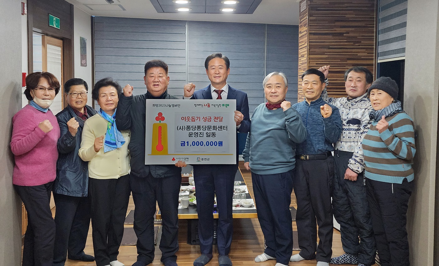 [강원사회복지신문 홍기한 기자]=(사)퐁당퐁당문화센터 운영진 일동은 지난 12월 15일 '희망2023나눔캠페인' 이웃돕기 성금 100만원을 기탁했다. 퐁당퐁당문화센터는 홍천읍 농촌중심지 활성화사업의 일환으로 조성된 주민 소통공간으로 다양한 문화프로그램을 운영하고 있다. 기탁된 성금은 운영진 일동이 십시일반으로 모았...