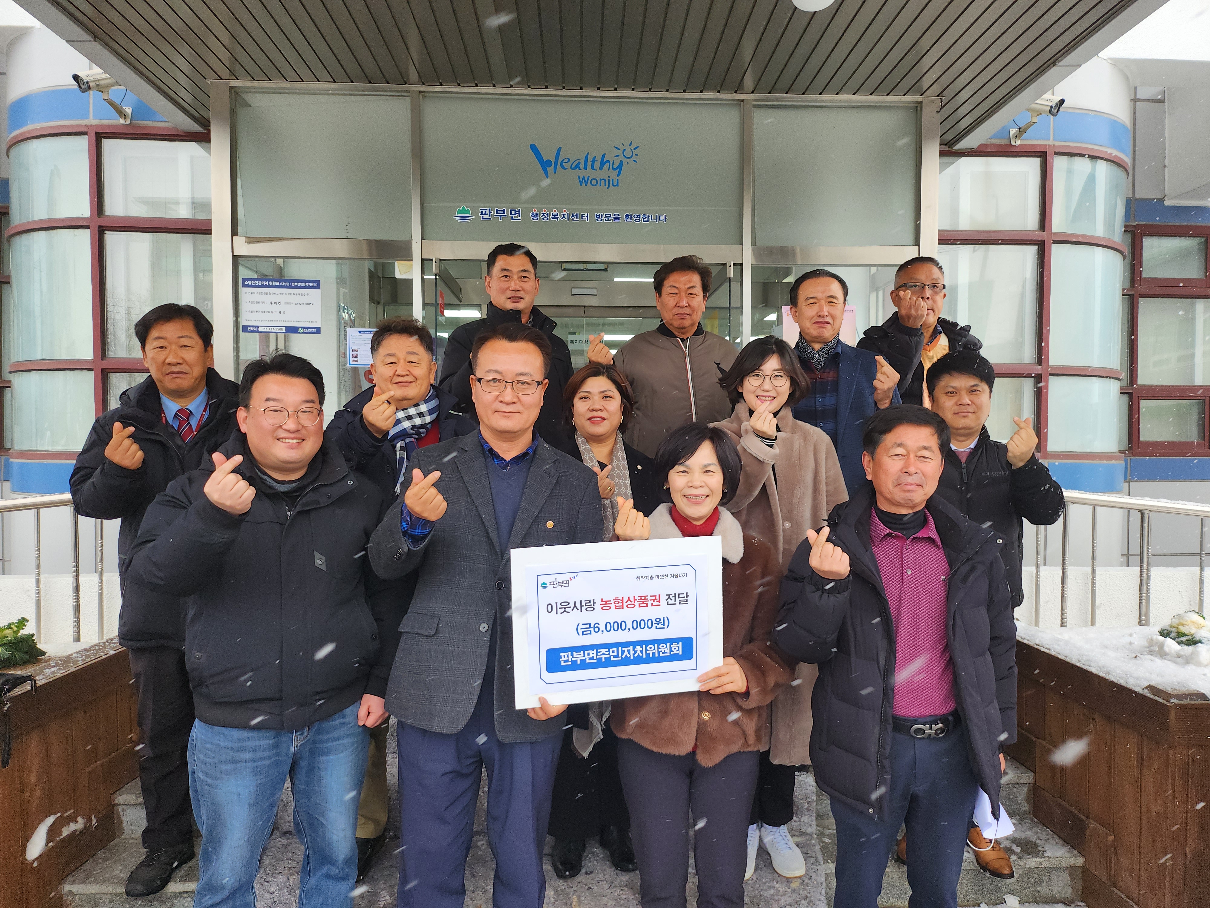 [강원사회복지신문 이정환 기자]=원주시 판부면 주민자치위원회(위원장 고성춘)는 지난 12월 15일 관내 취약계층에게 전달해달라며 농협상품권 600만 원을 판부면 행정복지센터에 기탁했다. 이날 회원들은 직접 30가구를 방문해 상품권 20만 원씩을 각각 전달했다.