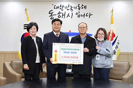 [강원사회복지신문 김종한 기자]=박대현 북삼동 지역사회보장협의체 위원장은 지난 12월 15일 동해시 북삼동 관내의 저소득 아동·청소년을 위해 써달라며, 이웃돕기 성금 200만원을 기탁했다. 박대현 위원장은 매년 저소득계층을 위해 기부활동을 꾸준히 해왔으며 올해는 북삼동 지역사회보장협의체에 성금 400만원을 지정 ...