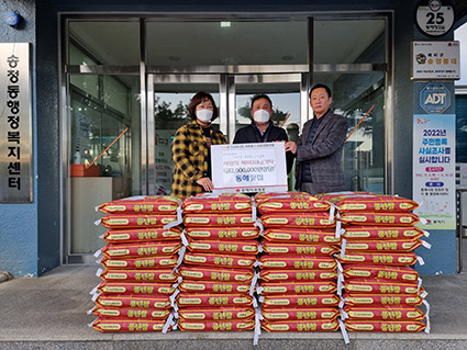 [강원사회복지신문 김도연 기자]=동해횟집(대표 김순희)에서 동해시 송정동 관내 어려운 가정에 전달해 달라며, 백미(10kg) 80포를 송정동행정복지센터에 기탁하였다.