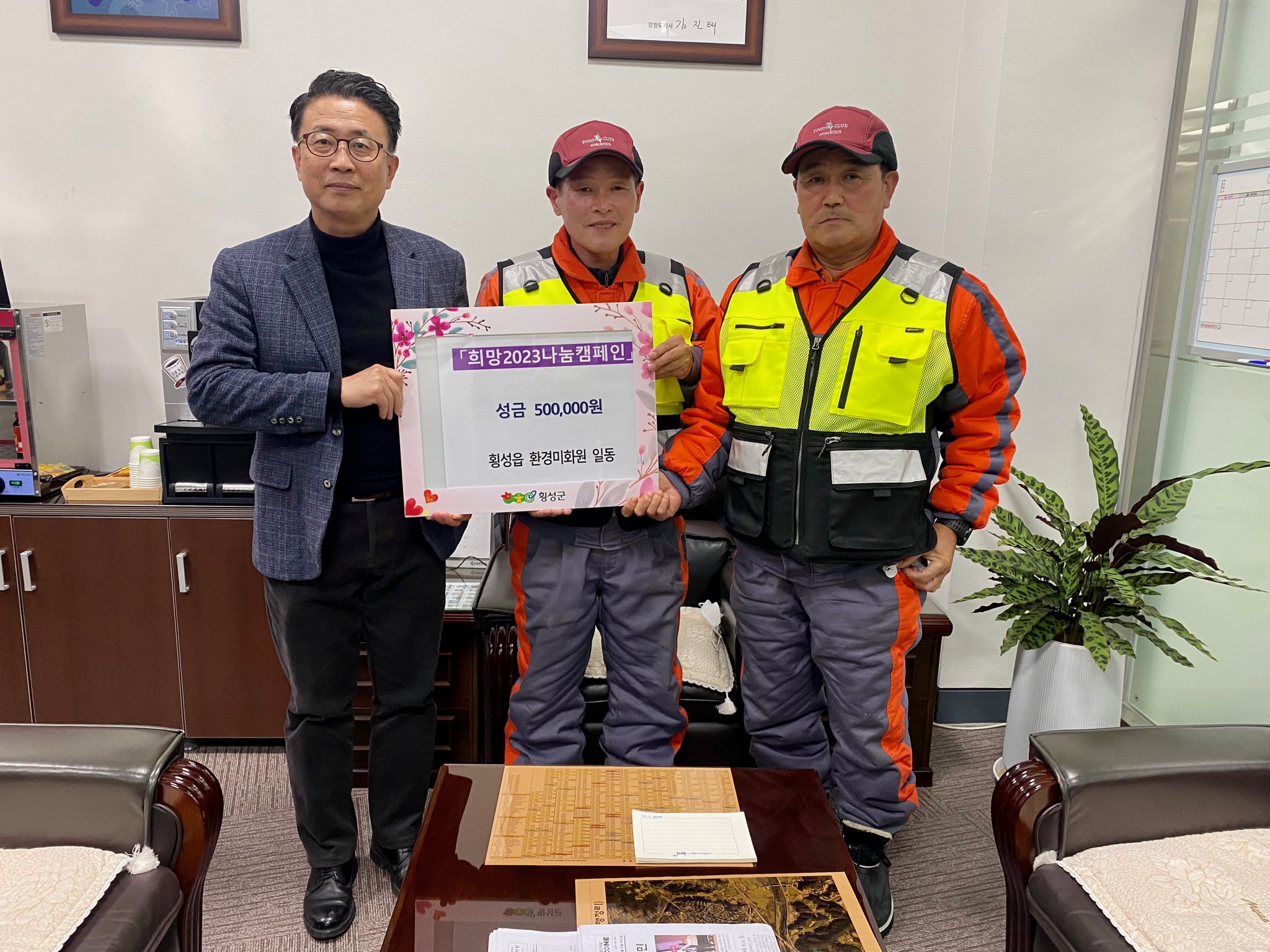 [강원사회복지신문 홍기한 기자]=횡성읍 환경미화원 일동(반장, 원용민)은 지난 12월 15일 횡성읍 행정복지센터를 방문해 이웃돕기 성금 50만원을 기탁했다. 원용민 반장은 "작은 정성이지만, 소외된 이웃에게 따뜻한 마음으로 잘 전달되기를 바란다"고 말했다. 이에 윤석윤 횡성읍장은 "보이지 않는 곳에서 항상 고생하시는...