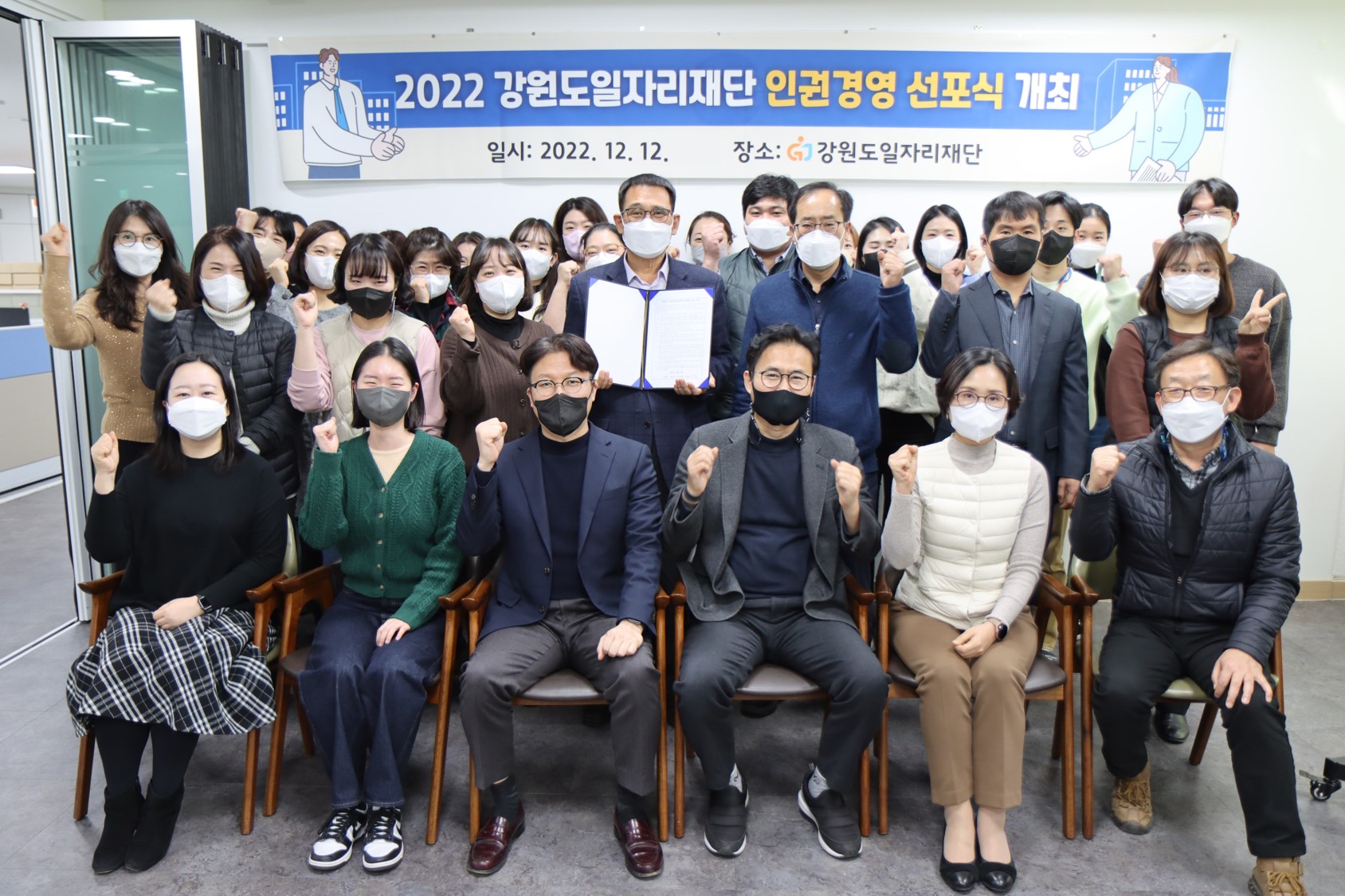 [강원사회복지신문 홍기한 기자]=재단법인 강원도일자리재단(대표이사 박광용)은 지난 12월 12일 재단 회의실에서 전 직원이 참석한 가운데 인권경영 선포식을 개최했다. 이날 선포식은 인권존중에 대한 사회적인 관심과 필요성이 증대함에 따라 ESG 인권경영체계를 활성화하여 인권이 존중받는 사회를 만드는데 솔선수범하고...