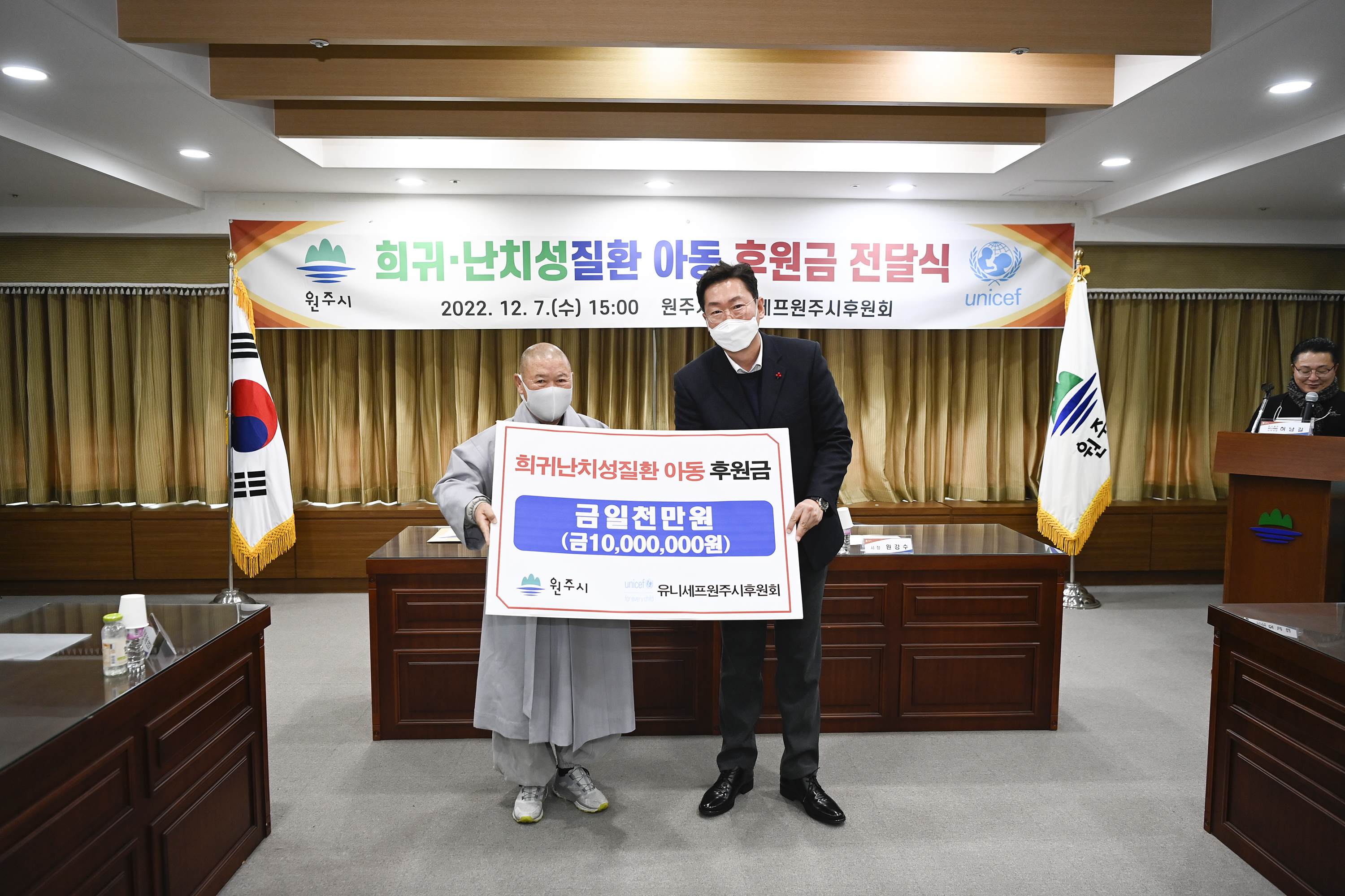 [강원사회복지신문 김도연 기자]=유니세프 원주시후원회(회장 김효종)는 지난 12월 7일 원주시청 투자상담실에서 희귀난치성 질환 아동을 위한 후원금 1,000만 원을 원주시에 전달했다. 이번 후원금은 지난 11월 12일 열린 아동권리 옹호를 위한 기금 마련 행사 '어린이가 행복한 세상 유니세프 원주 가을음악회'를 통해 마련...
