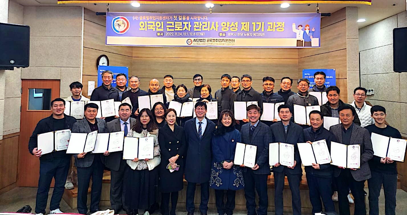 [강원사회복지신문 서은진 기자]=고용노동부 인가 '(사)글로벌취업지원센터'(이사장 김동성)는 국내 고용 창출의 일환으로 외국인근로자를 관리 할 수 있는 민간자격증을 등록하여 지난 12월 8일 평택시 장당 노동자 복지회관에서 '제1회 외국근로자관리사' 양성 과정을 실시 하여 수료식과 함께 30명의 외국인근로자관리사를...