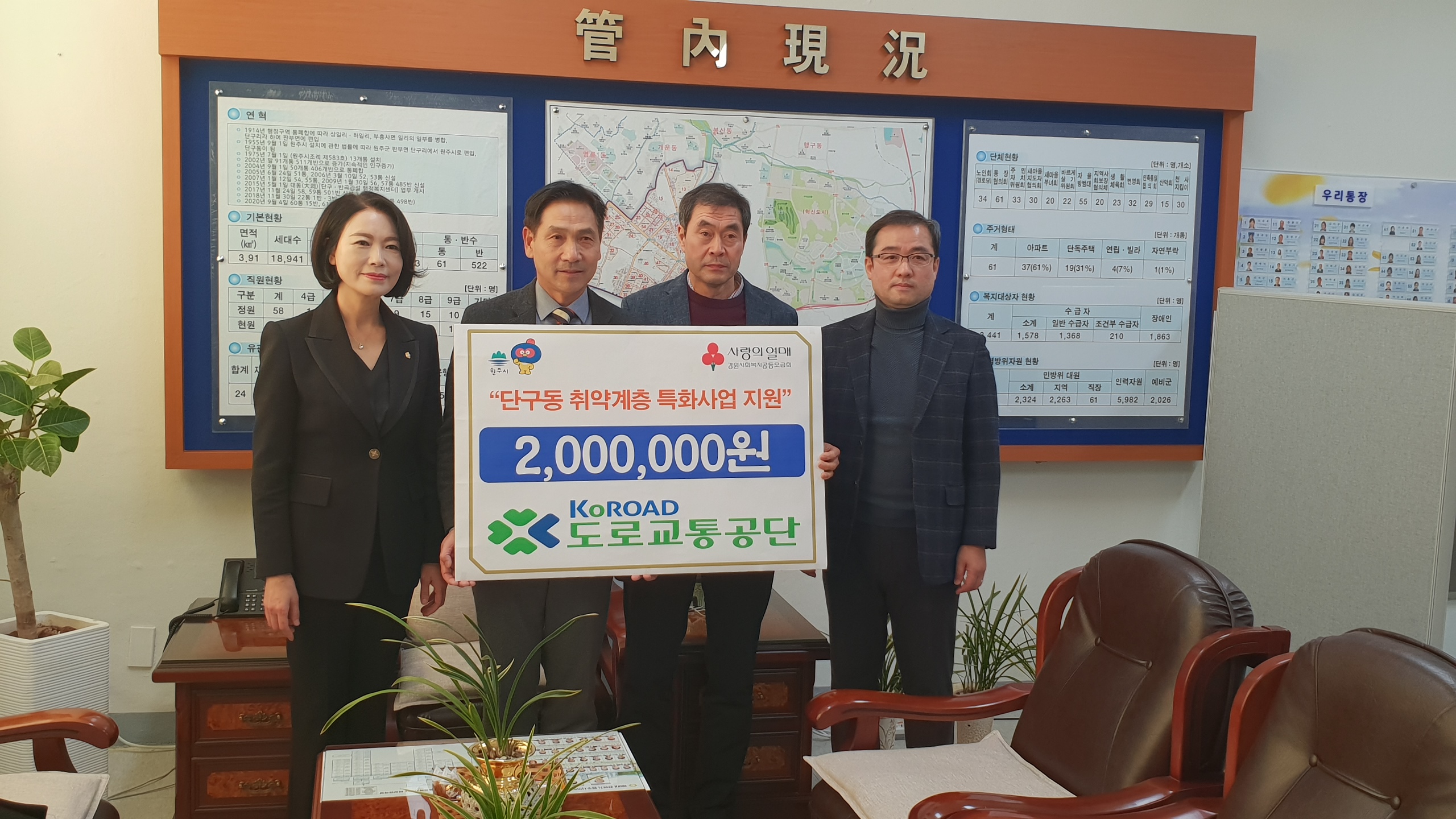 [강원사회복지신문 서은진 기자]=도로교통공단은 지난 12월 5일 원주시 단구동 행정복지센터를 찾아 저소득 취약계층을 위해 써달라며 후원금 200만 원을 기부했다. 김용호 ESG경영실장은 "연말연시를 맞아 소외된 이웃들이 따뜻한 겨울을 보낼 수 있도록 작은 정성을 더하고자 기부에 동참하게 됐다."라고 말했다. 전달된 후...