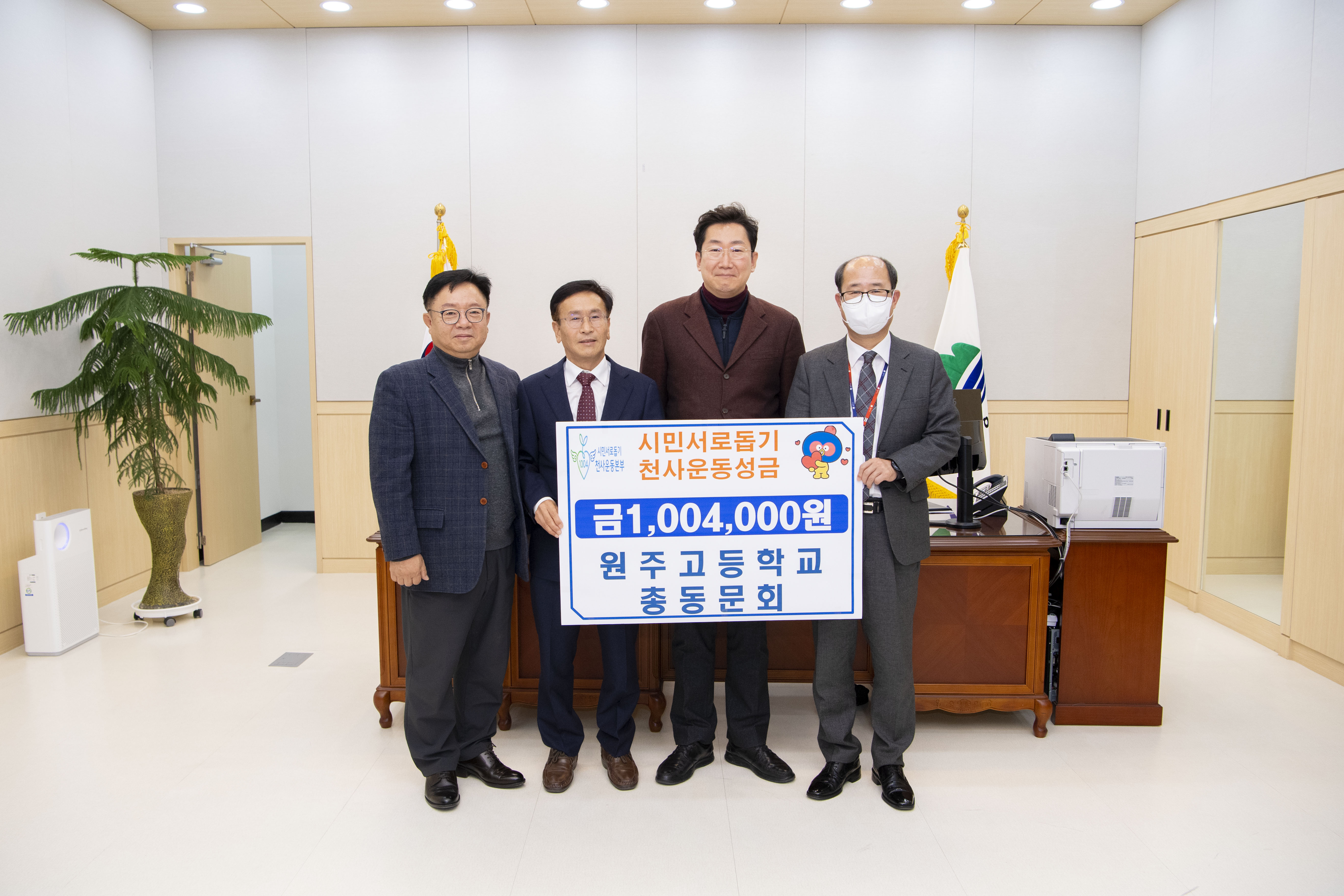 [강원사회복지신문 서은진 기자]=원주고등학교 총동문회(회장 유길선)는 지난 12월 2일 오후 2시 원주시청 시장 집무실에서 유길선 회장, 김용석 원사모 회장이 참석한 가운데 시민서로돕기 천사운동 후원금 100만 4천 원을 기탁했다. 유길선 회장은 "동문들의 뜻을 모아 지역사회에 어려운 이웃을 돕는 천사운동 후원금을 전...
