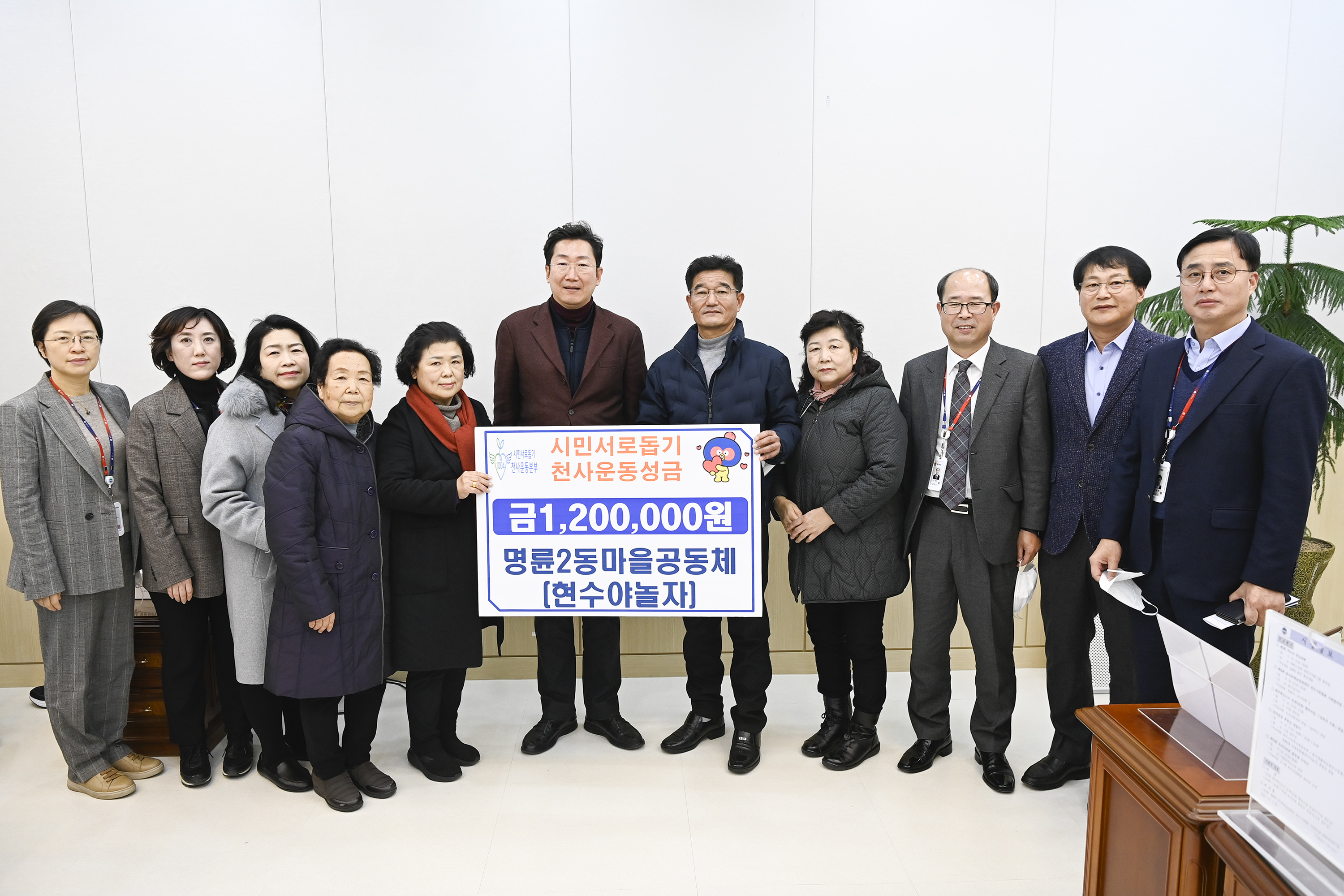 [강원사회복지신문 이정환 기자]=원주시 명륜2동 마을공동체 '현수야 놀자'(회장 황종훈)는 지난 12월 2일 오후 3시 원주시청 시장 집무실에서 시민서로돕기 천사운동 후원금 120만 원을 기탁했다. 명륜2동 마을공동체 '현수야 놀자'는 2019년부터 낙후된 동네에 활기를 불어넣고 더불어 살아가는 공동체 의식을 확산하고자 ...