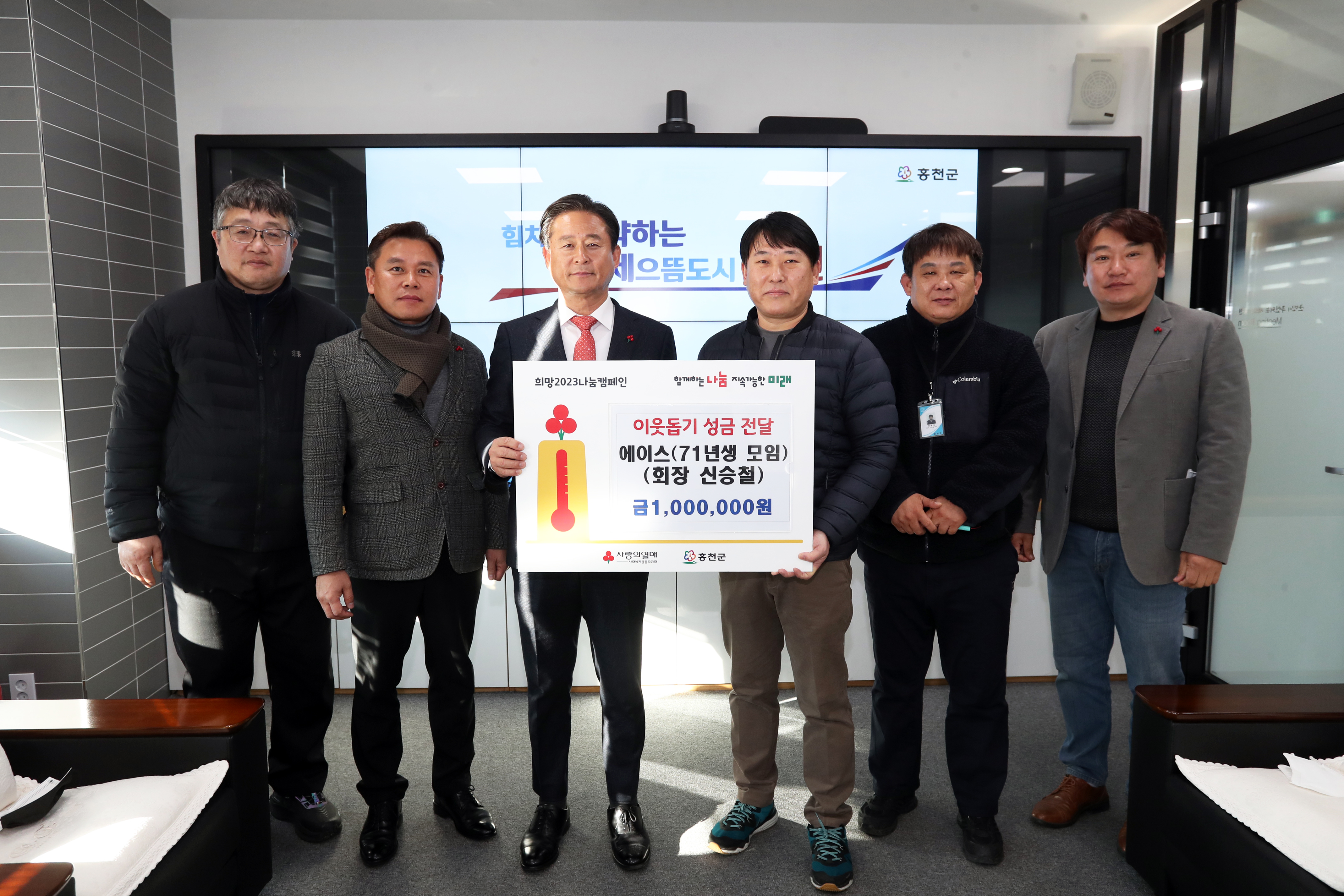 [강원사회복지신문 김도연 기자]=에이스(71년생 모임)는 지난 12월 2일 홍천군청을 방문, '희망2023나눔캠페인' 성금 100만원을 기탁했다. 신승철 회장은 "회원들과 뜻을 모아 성금을 마련했다”며, “동절기 어려운 이웃들에게 조금이나 도움이 되고자 후원을 하게 됐다"고 말했다. 신영재 홍천군수는 "이웃들에게 온정을 전...