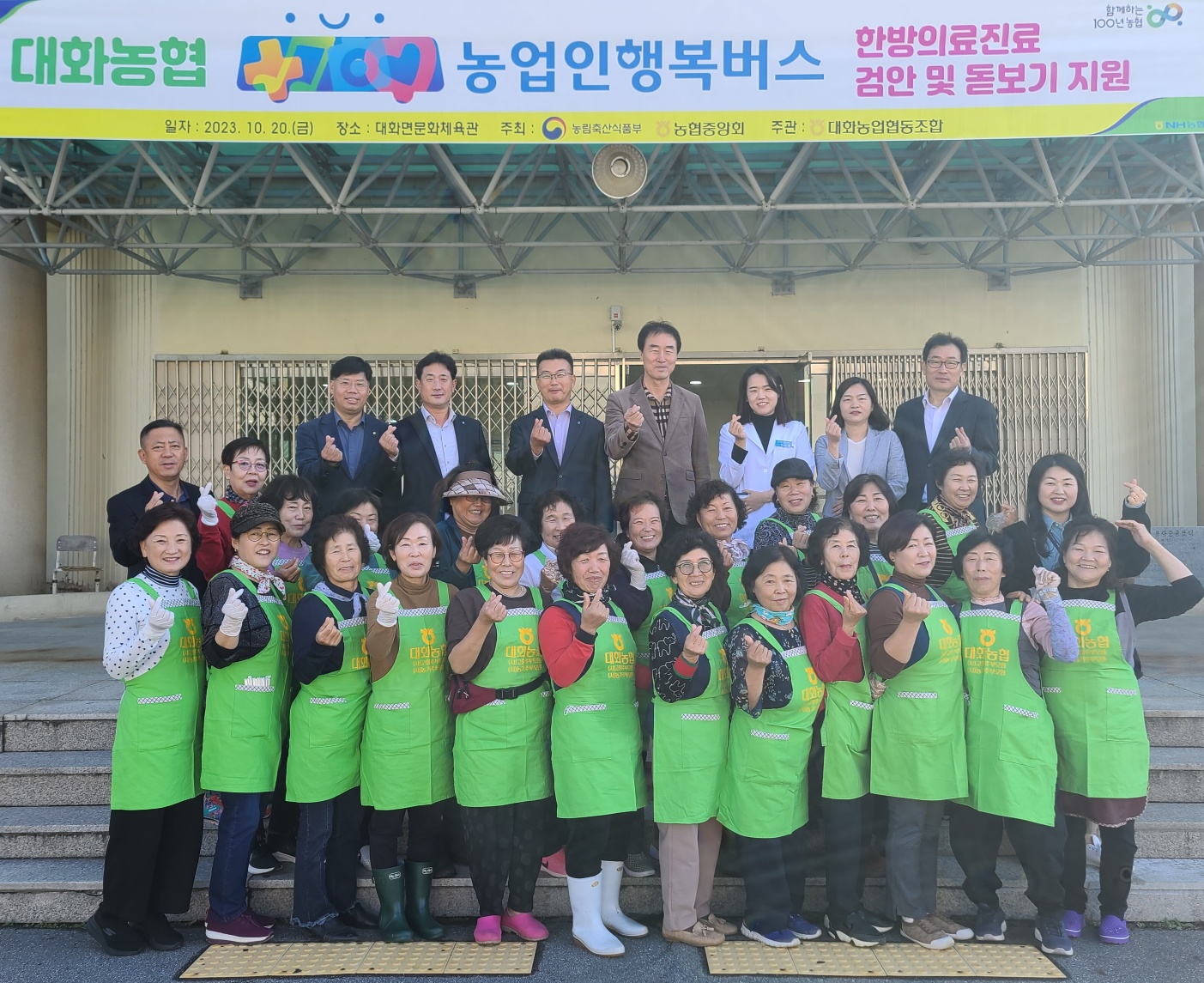 대화농협(조합장 김진복)은 대화면문화체육관에서 60세 이상 농업인 300여명을 대상으로 '농업인행복버스'를 실시하였다. '농업인행복버스'는 농림축산식품부와 농협이 공동으로 추진하는 사업으로 복지 접근성이 떨어지는 농촌지역을 찾아 복지서비스를 제공하는 사업이다. 이날 농업인 행복버스는 상지대부속한방병원(병원...