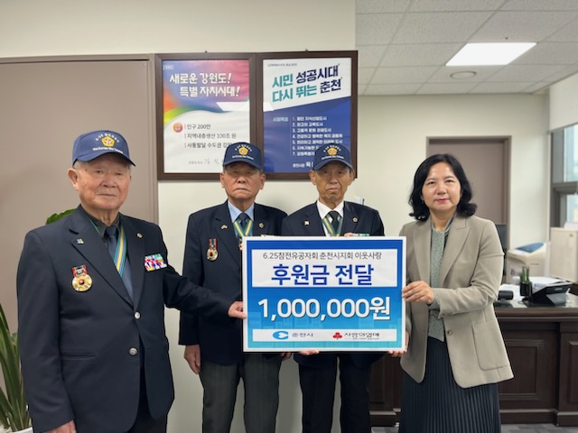 6·25 참전 유공자회 춘천시지회(대표:염기원)가 지난 10월 19일 춘천시청을 방문해 저소득 6·25 참전 유공자(고성 수해 피해 6?25 참전 유공자)를 위한 지역 돕기 성금 100만 원을 전달했다.(사진: 좌측부터 부지회장 조성교, 김영수 / 지회장 염기원)