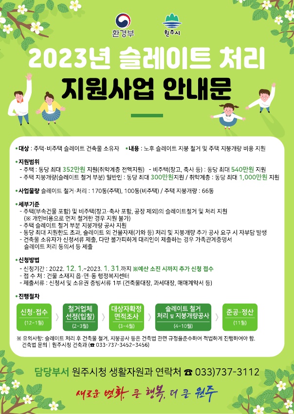 [강원사회복지신문 서은진 기자]=주택 최대 352만 원, 비주택 540만 원 한도 기초생활수급자, 차상위계층, 저소득 장애인·독거노인 철거 비용 전액 지원 원주시는 노후 슬레이트에서 발생하는 석면으로 인한 시민 건강 피해 예방 및 경제적 취약계층의 주거환경 개선을 위해 '2023년 슬레이트 처리 지원사업'을 추진한다. 주...
