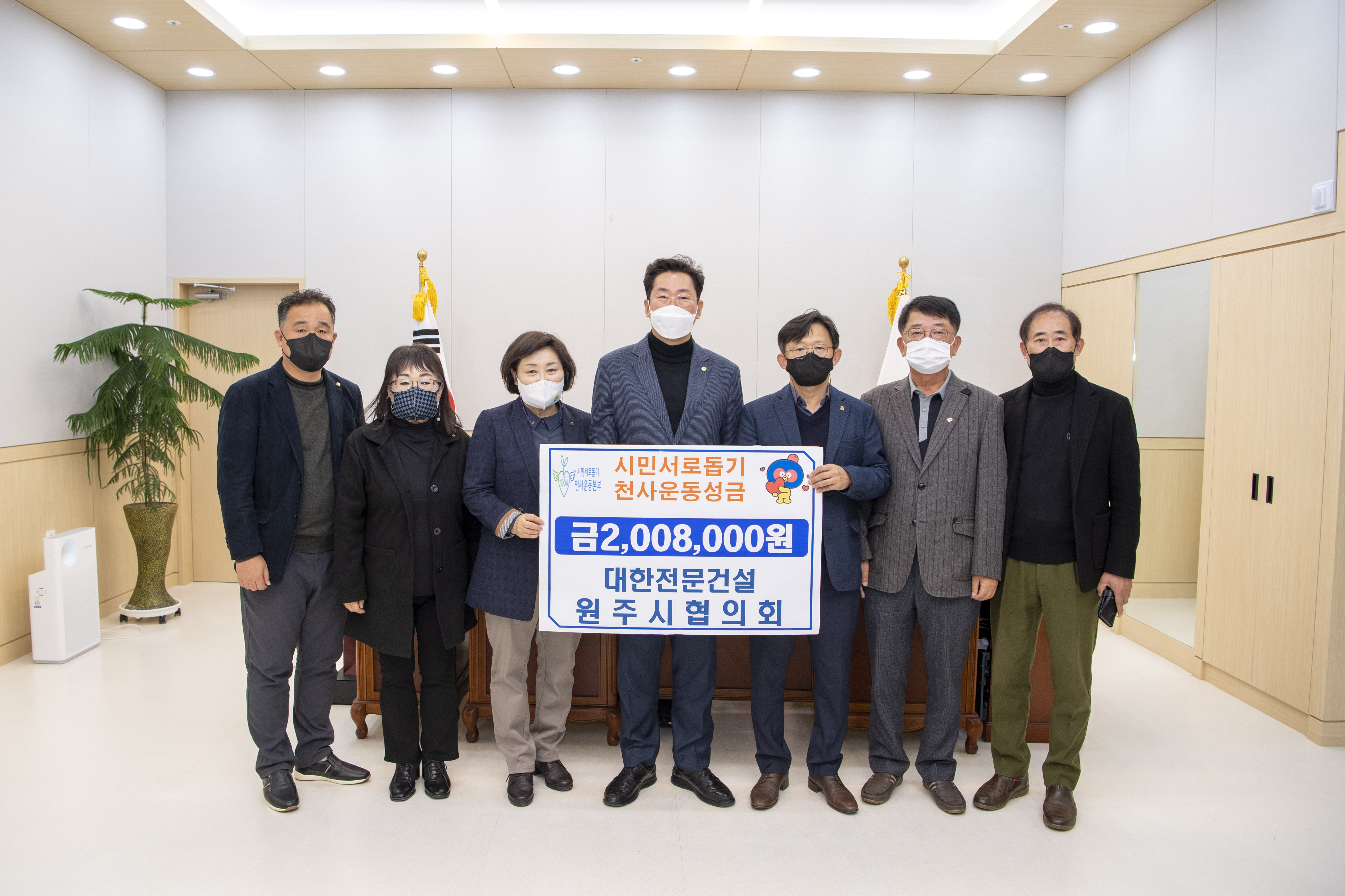 [강원사회복지신문 서은진 기자]=대한전문건설 원주시협의회(회장 오성진)는 지난 11월 23일 오후 4시 원주시청 7층 투자상담실에서 시민서로돕기 천사운동 후원금 2,008천원을 기탁했다. 이날 전달식에는 대한전문건설 원주시협의회 오성진 회장, 김용호 부회장, 박웅 운영위원, 엄주빈 사무국장, 지은희 천사운동본부장, 김...