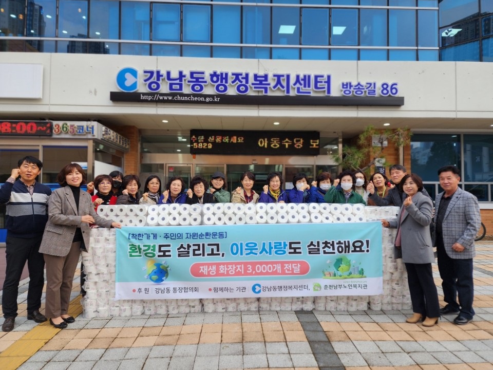 [강원사회복지신문 김도연 기자]=강남동통장협의회 7월부터 11월까지 우유팩 수거 및 세척 후 재생화장지 교환 우유팩 45만개→재생화장지 3,000개 교환, 환경보호 및 이웃사랑 실천 통장님들이 우유팩을 재생화장지로 교환한 후 기부한 사례가 있어 눈길을 끌고 있다. 춘천시에 따르면 강남동통장협의회(회장:이인구)는 춘천...