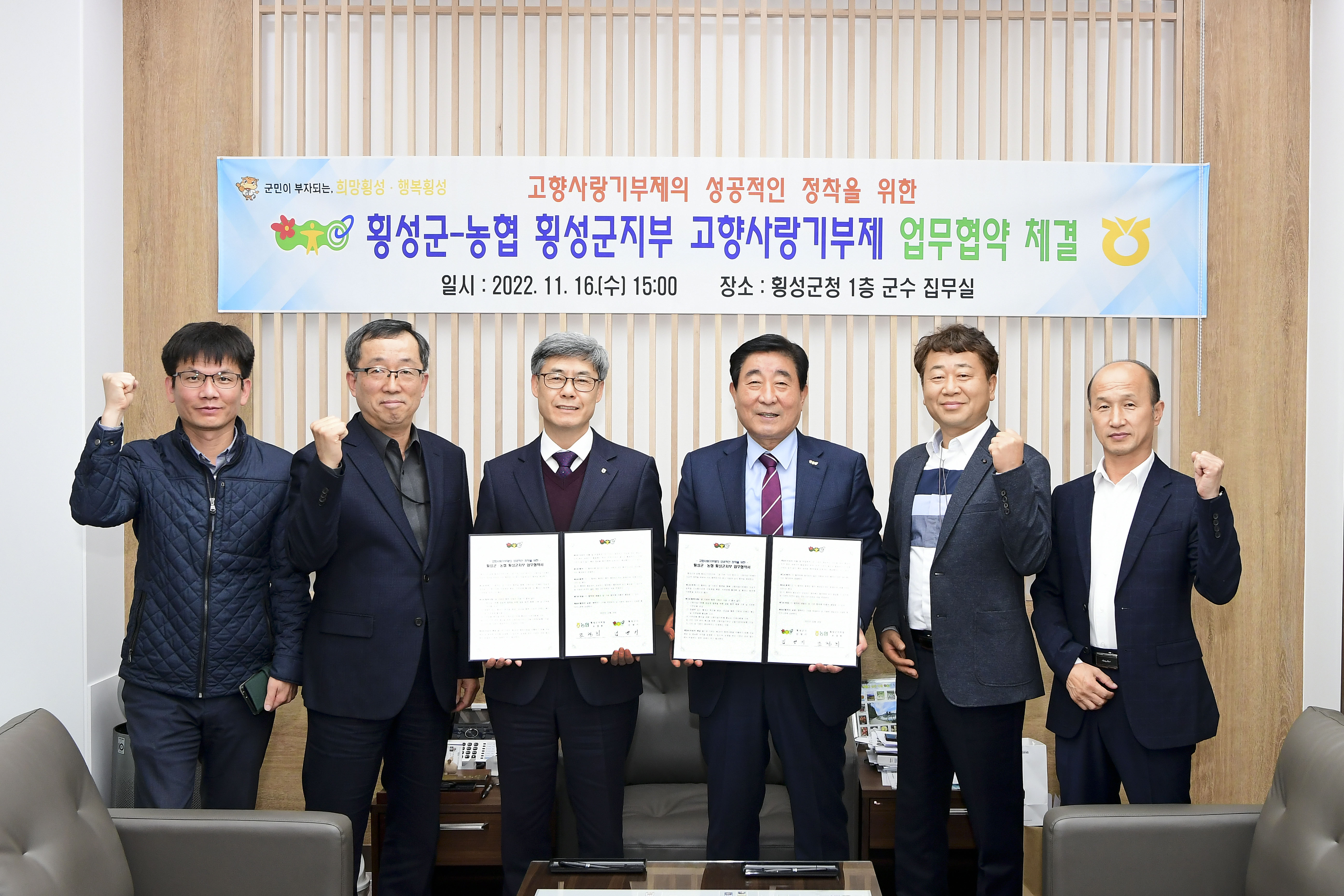 [강원사회복지신문 홍기한 기자]=횡성군과 농협 횡성군지부는 지난 11월 16일 오후 3시, 군수 집무실에서 고향사랑기부제 활성화를 위한 업무협약을 체결했다. '고향사랑기부제'는 개인이 본인의 주소지 외의 지자체(기초광역)에 연간 500만원 한도에서 기부하면 기부자에게는 세액 공제 및 답례품 혜택을 주고, 지자체는 지...