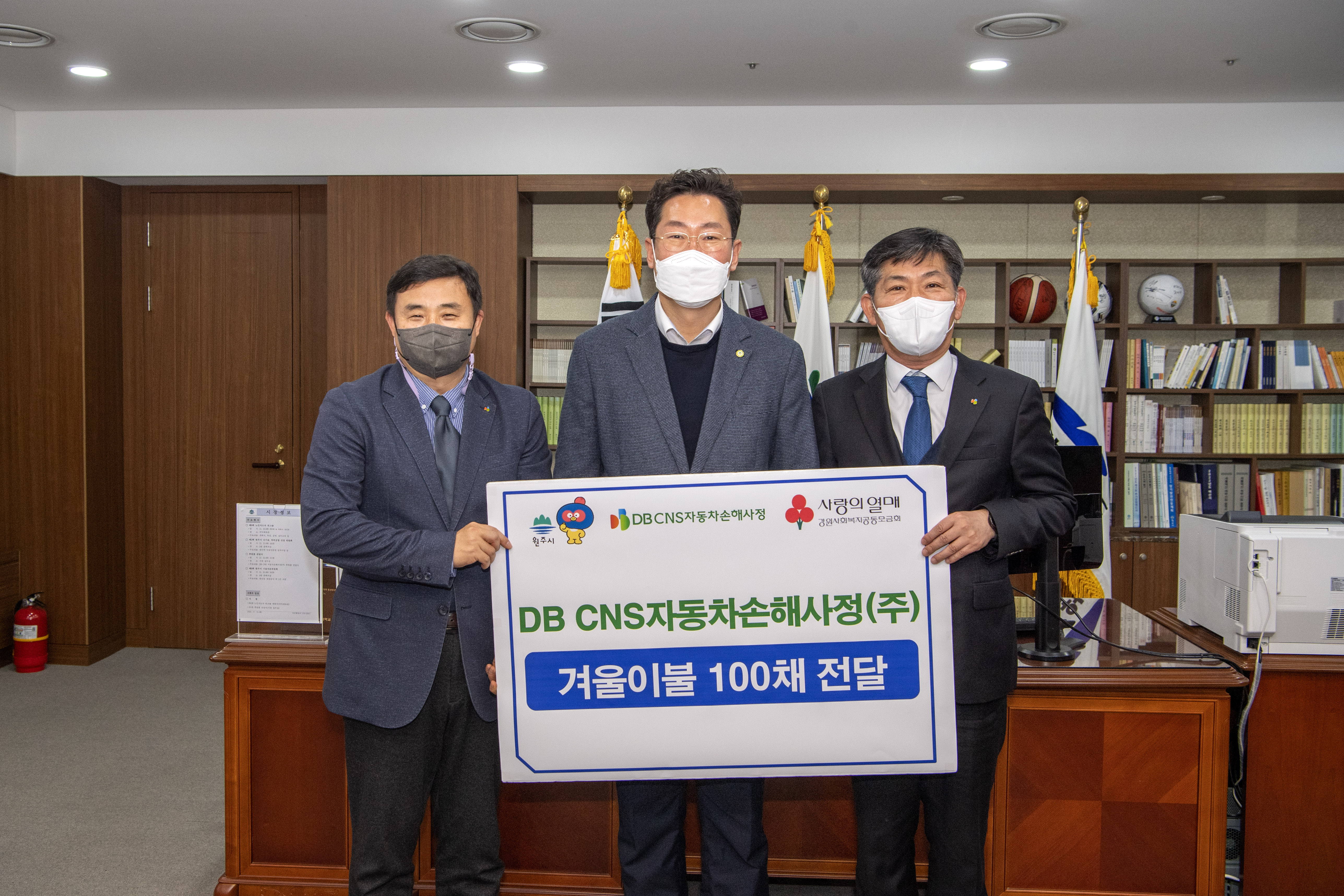 [강원사회복지신문 서은진 기자]=DB CNS자동차손해사정(주)(대표 홍기창)은 지난 11월 15일 오후 원주시청 시장집무실을 방문해 이불 100채를 전달했다. 이번에 전달받은 후원품은 사회복지 공동모금회를 통해 저소득층에게 전달될 예정이다. 홍기창 대표는 "코로나19로 어려운 지역사회에 조금이나마 도움이 되길 바란다."라...