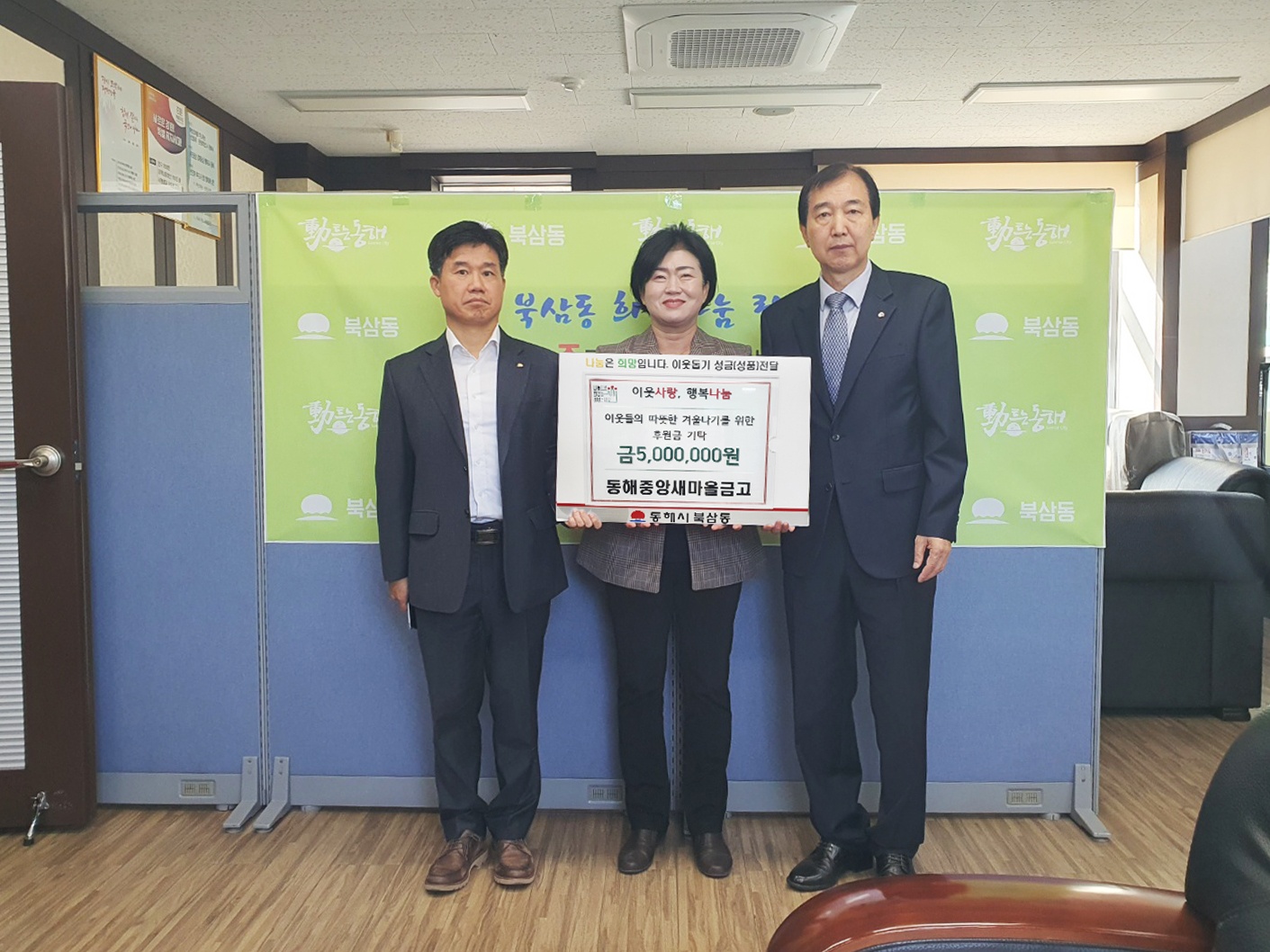 동해중앙새마을금고(이사장 정영교)는 지난 10월 18일(수) 동절기를 앞두고 관내 어려운 이웃을 위해 삼화동에 연탄 5,000장, 성금 500만원과 북삼동에 성금 500만원을 기탁하였다. 동해중앙새마을금고는 매년 어려운 이웃을 위한 물품 후원, 성금 기탁 등 다양한 나눔 활동을 통해 행복한 지역사회 만들기를 위한 사회공헌 ...