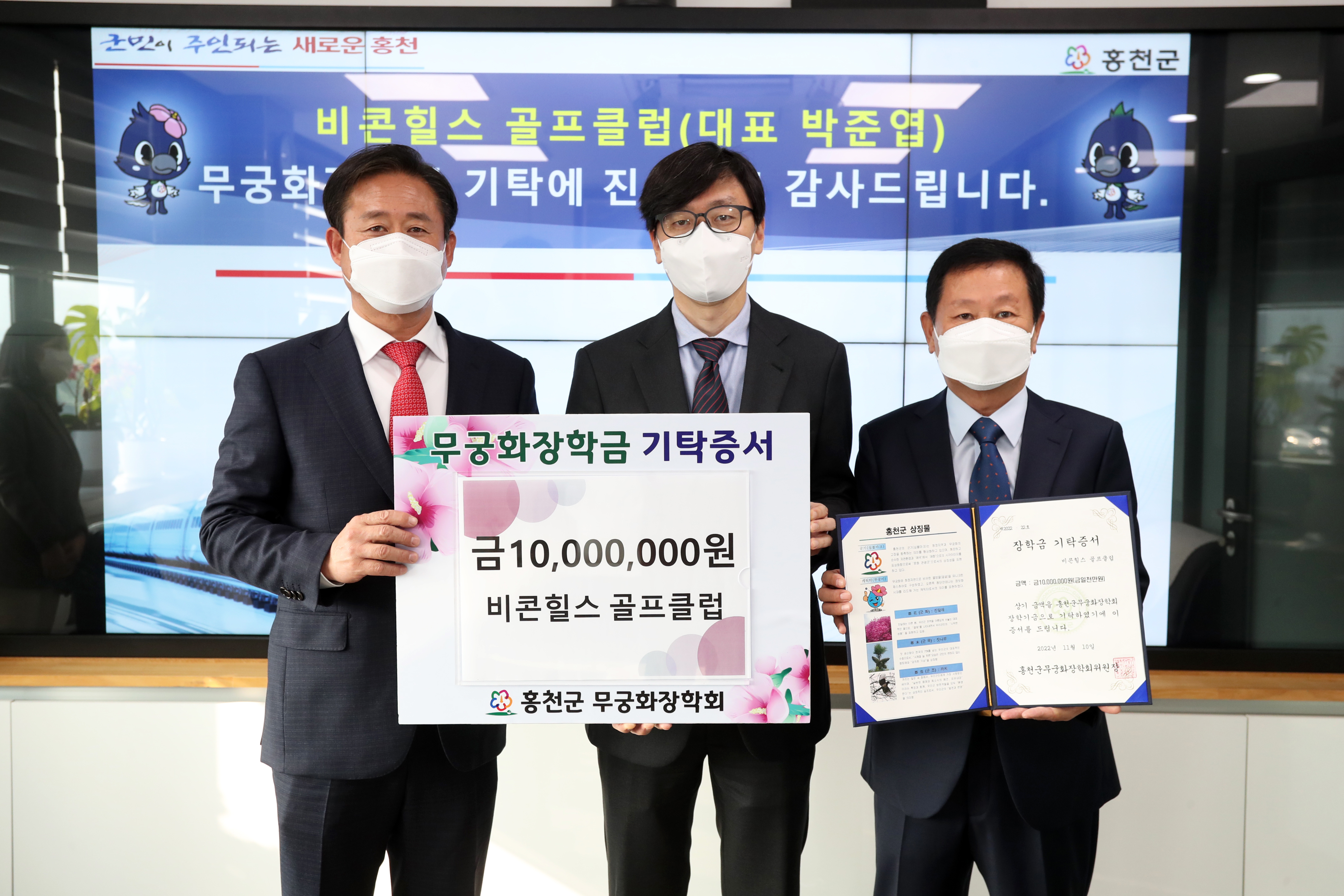 [강원사회복지신문 이정환 기자]=비콘힐스골프클럽(대표 박준엽)은 지난 11월 10일 홍천군청을 방문, 인재육성을 위한 무궁화장학금으로 1,000만원을 기탁했다.