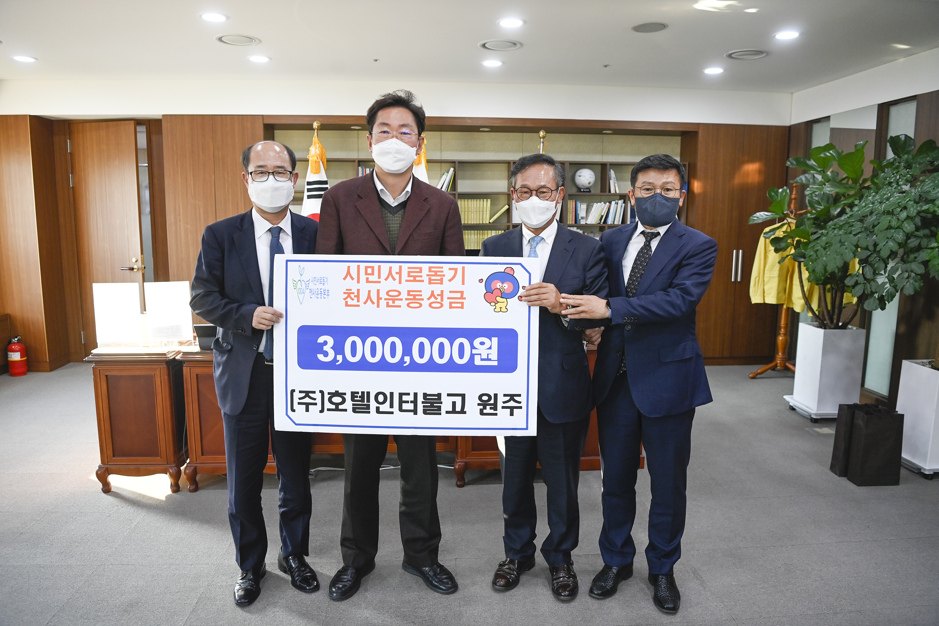 [강원사회복지신문 서은진 기자]=(주)호텔인터불고 원주(회장 김삼남)는 지난 10월 18일 시장 집무실에서 시민서로돕기 천사운동 후원금 300만 원을 기탁했다. 김삼남 회장은 "지난 9월 29일 개최된 호텔인터불고 연예인 자선골프대회 수익금을 천사운동 후원금으로 기탁하게 됐다."라며, "앞으로도 뜻깊은 자선행사를 통해 ...