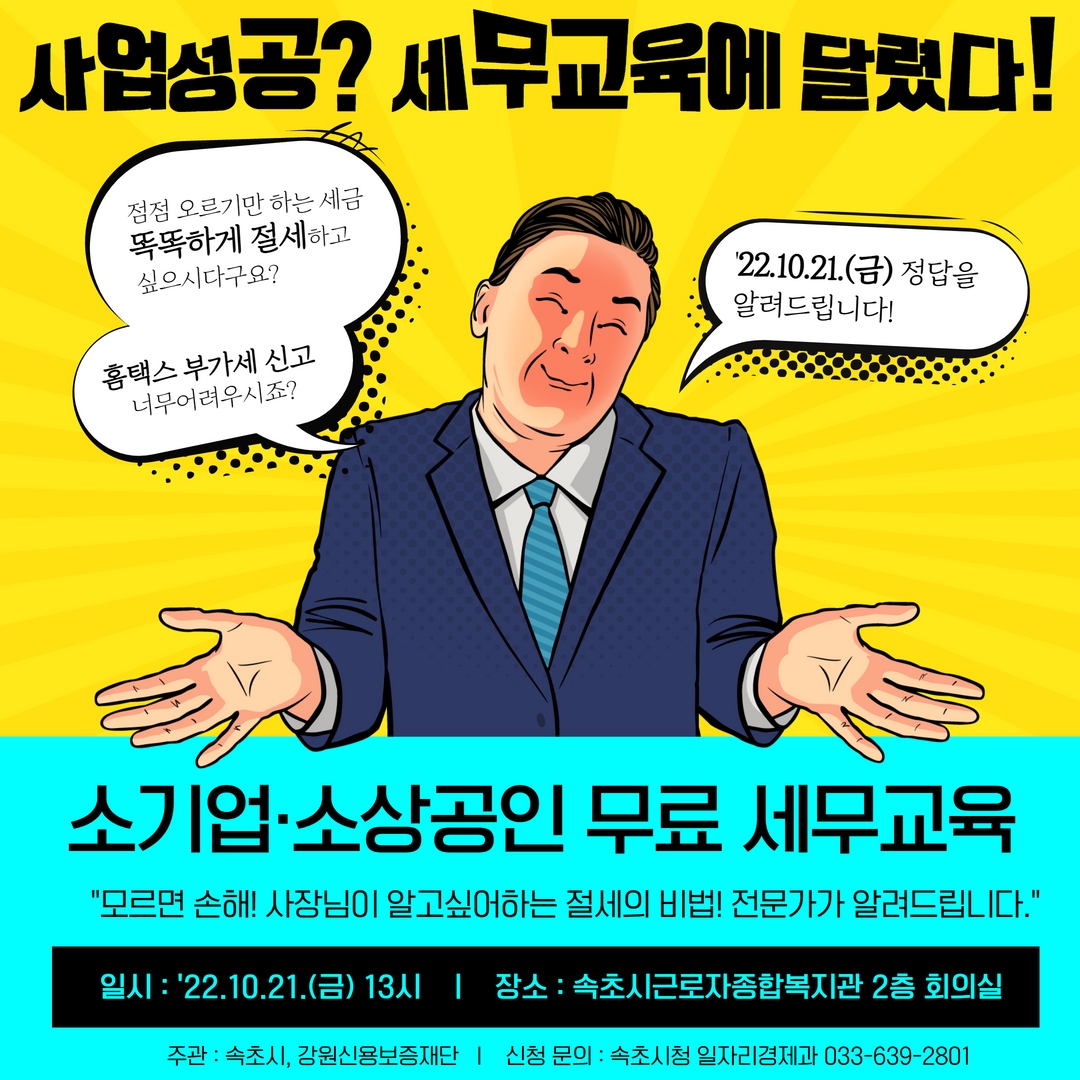 [강원사회복지신문 홍기한 기자]=세무전략 및 절차, 홈택스 부가가치세 신고방법 안내 등 속초시와 강원신용보증재단은 '세금 절세전략 및 홈택스 부가가치세 신고 방법'을 주제로 지난 10월 21일 오후 1시 속초시근로자종합복지관에서 소기업·소상공인 대상 무료 세무교육을 실시했다. 이번 교육은 통해 사업자 운영에 필요...