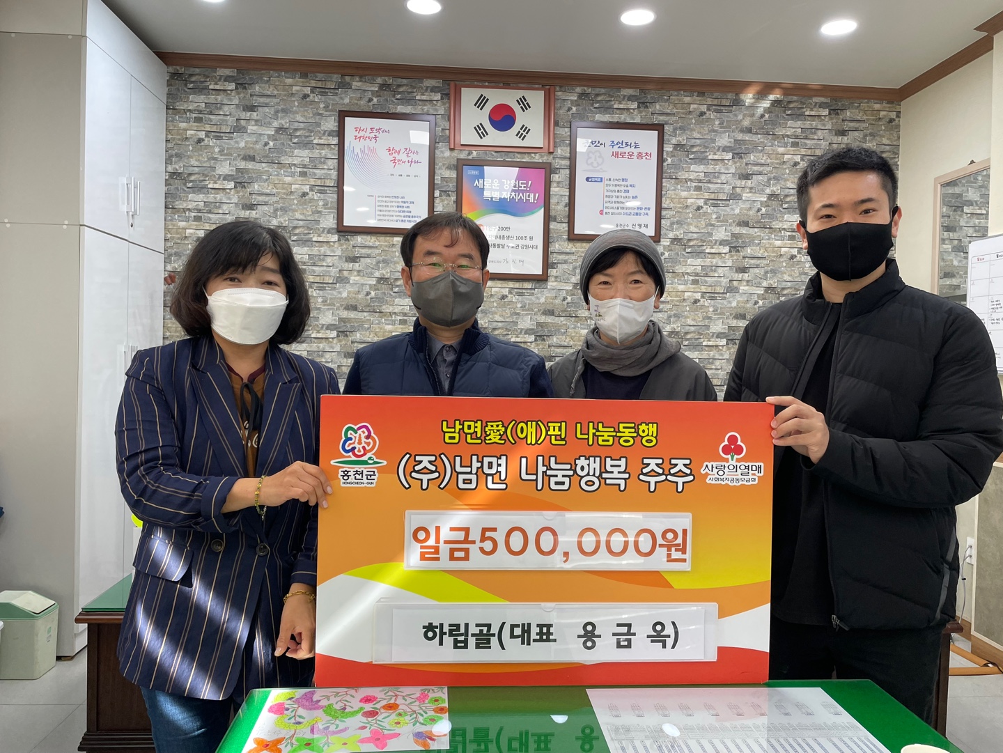 [강원사회복지신문 홍기한 기자]=홍천군 남면에서 수제꽃차를 생산하는 하립골(대표 용금옥)은 지난 10월 19일 남면행정복지센터를 방문, 어려운 이웃돕기 성금 50만원을 기탁했다. 용금옥 대표는 "하립골을 이용해 주신 고객님들께 감사의 의미로 '천원카페'를 20일 동안 무인으로 운영했다"며, 이곳에서 발생한 판매금 30만...