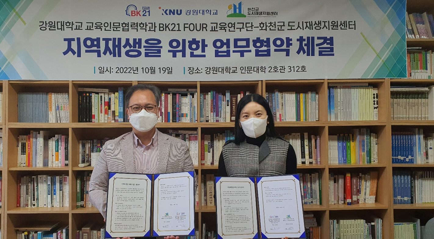 [강원사회복지신문 이정환 기자]=화천군 도시재생지원센터와 강원대 교육인문협력학과 BK21 FOUR 교육연구단은 지난 10월 19일 강원대에서 지역재생을 위한 업무협약식을 열고, 소통과 교류,협력체계를 구축키로 했다.