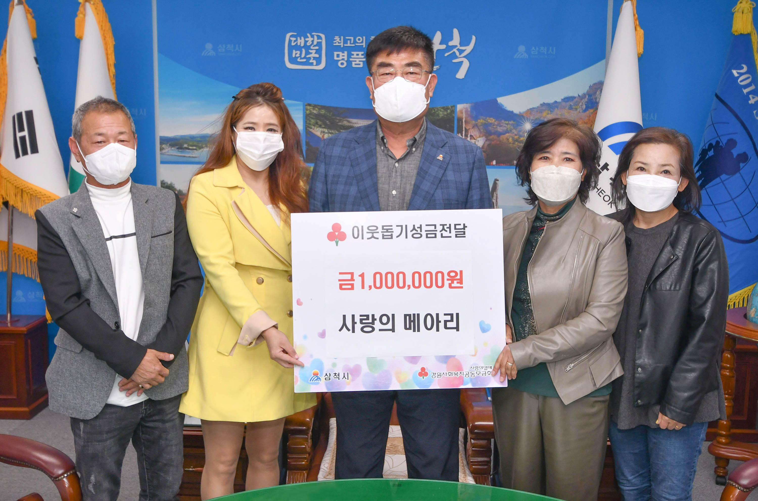 [강원사회복지신문 이정환 기자]=삼척 '사랑의 메아리' 노래동아리(대표 이지원)는 지난 10월 11일 삼척시청을 방문하여 이웃돕기성금 100만 원을 전달하였다. '사랑의 메아리'는 지역사회 재능기부 등 다양한 활동을 하고 있으며 코로나19로 중단된 공연을 다시 시작하며 올해로 4번째 모금된 성금을 기탁하면서 독거노인 등...