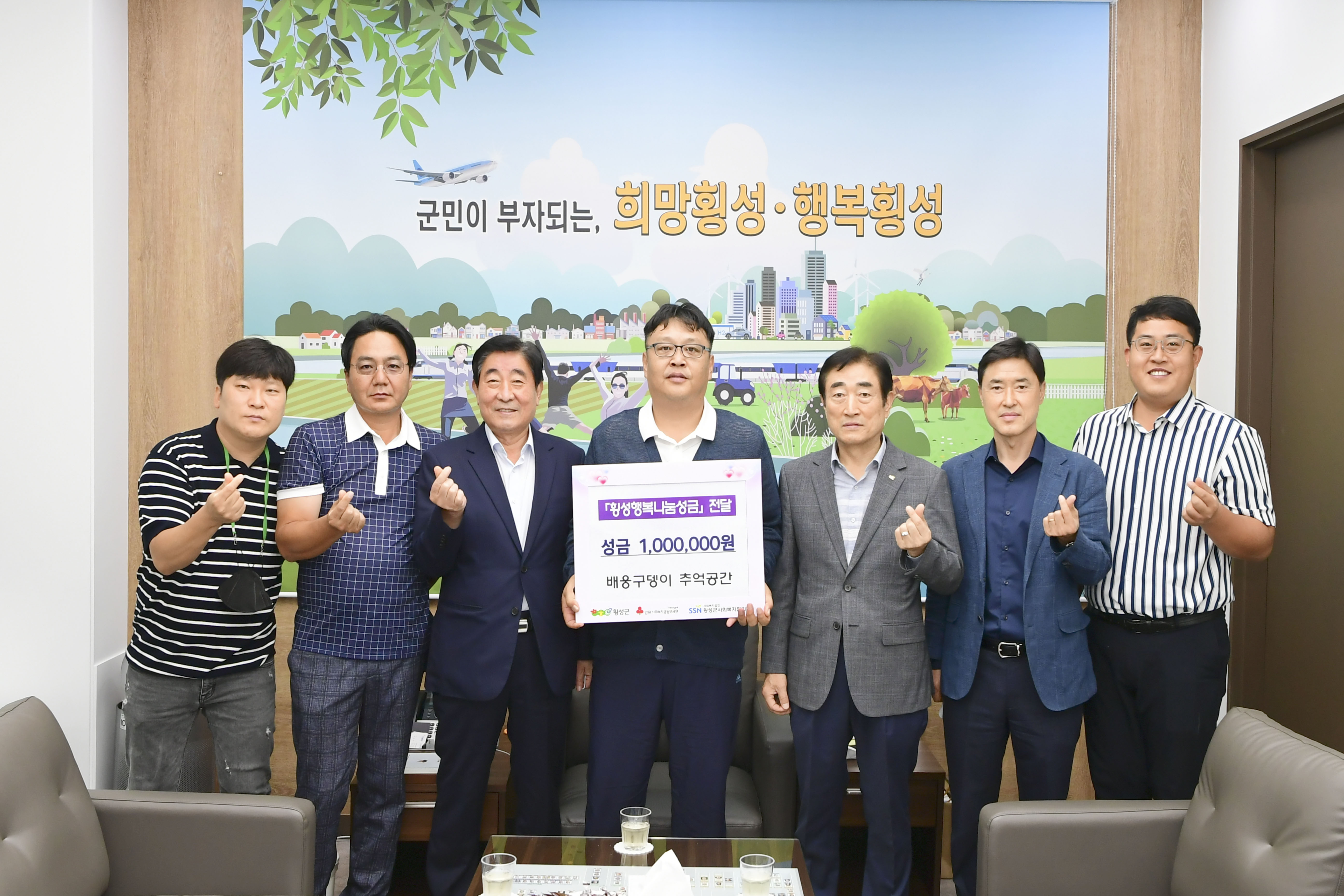 [강원사회복지신문 홍기한 기자]=배웅구뎅이 추억공간(회장 김진원)은 지난 9월 20일 오전 9시 40분, 군수집무실을 방문하여 '횡성행복나눔성금'에 성금 100만원을 기탁했다. 배웅구뎅이 추억공간은 횡성읍 읍상4리 청년회 모임으로 이날 전달식에 김명기 횡성군수, 이석원 횡성국사회복지협의회장, 김양섭 배웅구뎅이 운영부...