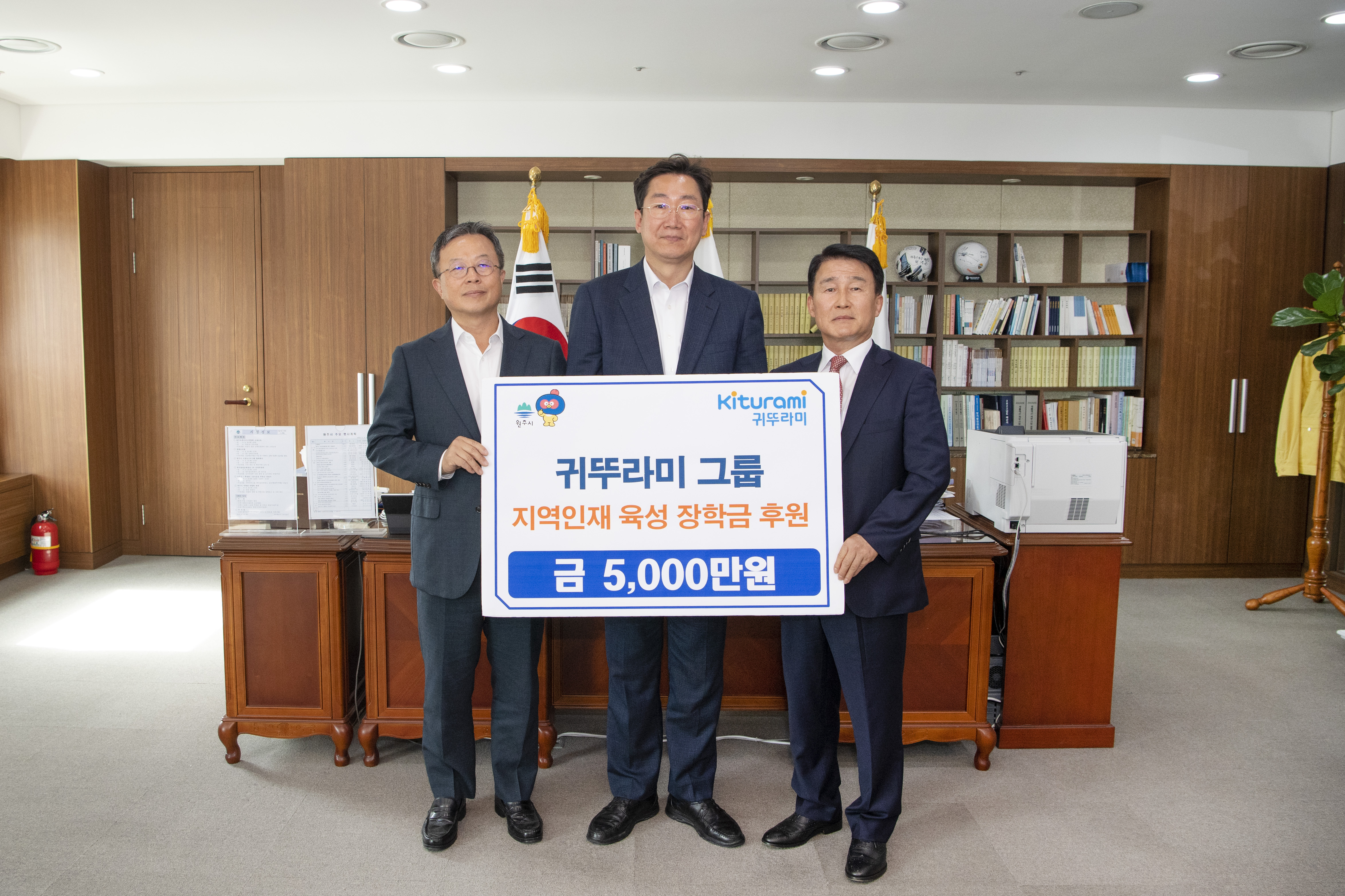 [강원사회복지신문 이정환 기자]=귀뚜라미그룹(회장 최진민)은 지난 9월 20일 원주시장 집무실을 방문해 지역인재 육성 장학금 5,000만 원을 기부했다. 이번에 전달된 후원금은 읍면동 행정복지센터 및 각 학교 추천을 통해 대학생 4명, 고등학생 38명 등 총 42명의 장학생을 선발해 대학생은 각 300만 원, 고등학생은 각 10...
