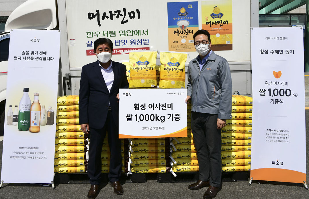 [강원사회복지신문 서은진 기자]=쌀 구매 후 특별재난지역인 횡성 수재민 지원 위해 횡성군 기부 횡성한우축제 참관객에도 배포, 쌀 소비 촉진 확대 나서 국순당이 쌀 소비 촉진과 농가 지원을 위한 쌀 나눔 공익 캠페인 '라이스 버킷 챌린지'에 참여해 지난여름 집중호우 피해로 특별재난지역으로 선포된 횡성지역 수해 피해...