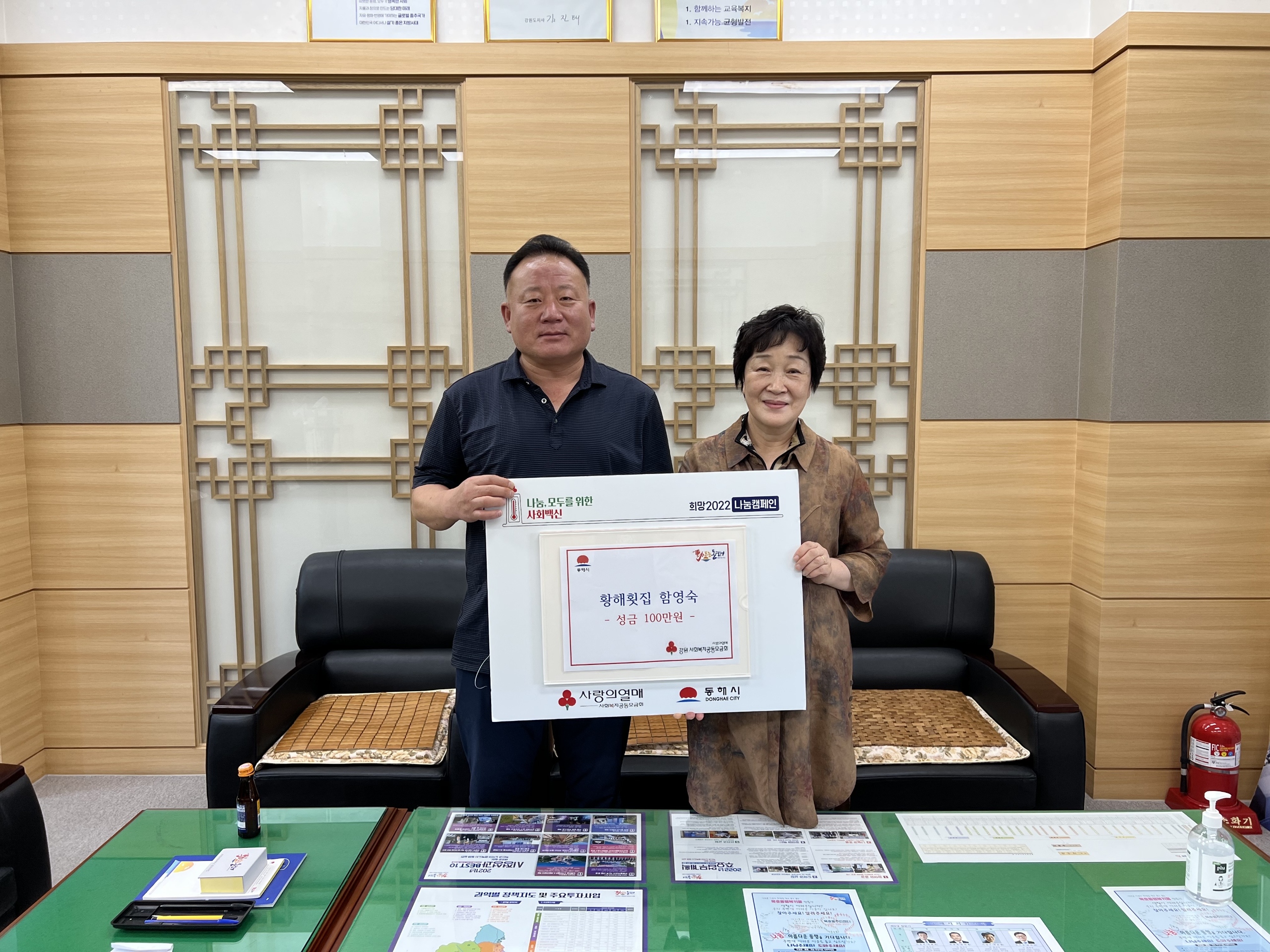 [강원사회복지신문 김종한 기자]=동해 묵호동 황해횟집(대표 함영숙)은 지난 9월 6일 관내 생활이 어려운 소외계층을 위해 사용해 달라며, 성금 100만원을 강원도공동모금회를 통해 묵호동행정복지센터에 지정 기탁했다고 밝혔다. 함영숙 황해횟집 대표는 "장기화된 코로나19로 인한 경제적으로 어려운 이웃들에게 희망을 전...