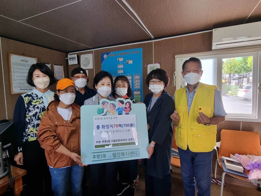 [강원사회복지신문 김도연 기자]=춘천시 후평3동 자율방범대(대장:송명수)는 자원재활용사업(우유팩 수거)으로 받은 롤 화장지 70개(700롤)를 관내 어려운 이웃을 위해 후원했다.