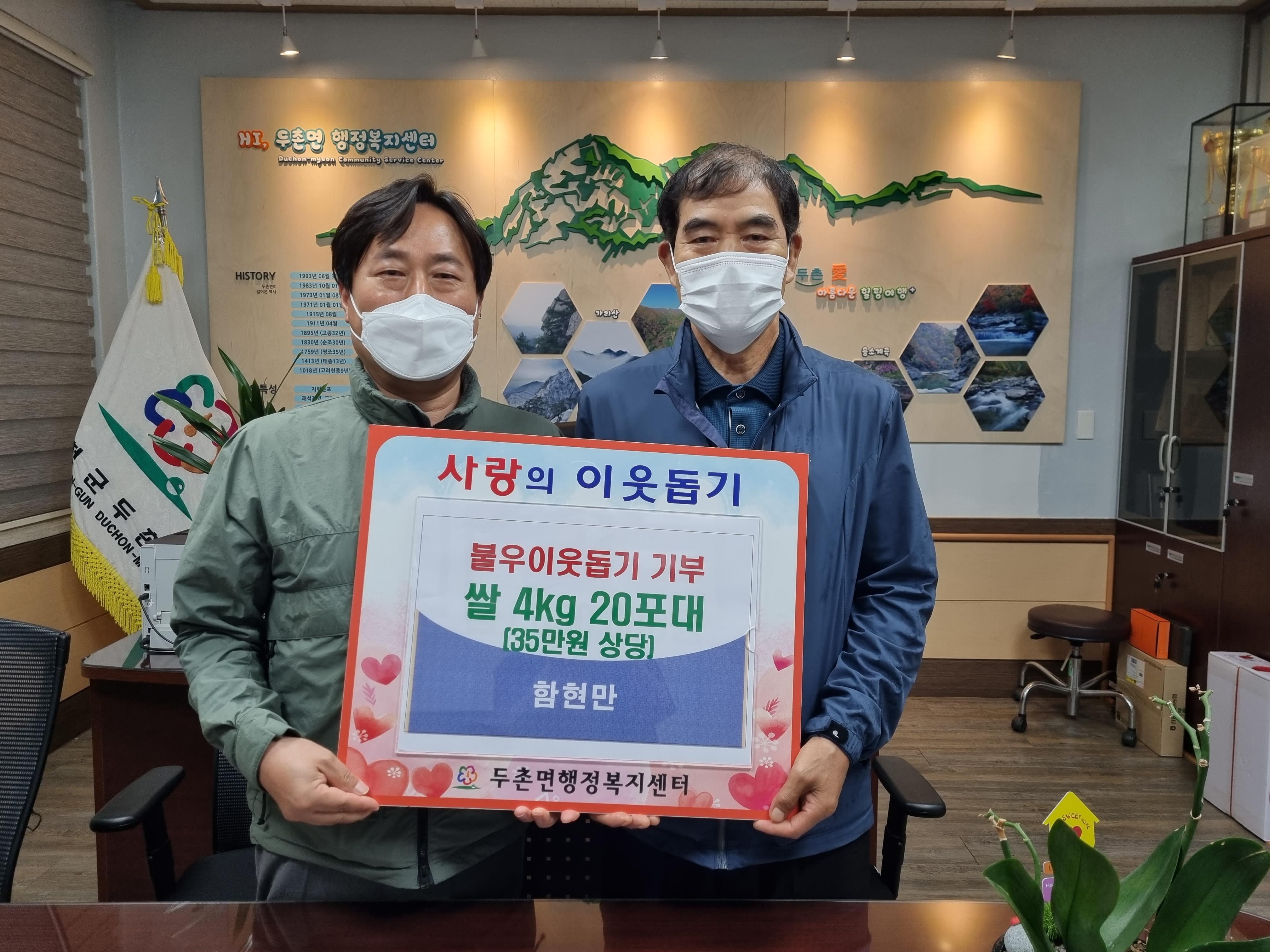 [강원사회복지신문 서은진 기자]=함현만 두촌 농촌지도자 회장은 지난 9월 5일 홍천군 두촌면 행정복지센터를 방문, 추석을 맞아 어려운 이웃에게 전달할 35만원 상당의 쌀 20포대(1포 4kg)를 지정 기탁했다. 전달된 쌀은 관내 저소득층 및 홀몸 어르신들에게 전달되었다. 장용기 두촌면장은 "추석을 앞두고 어려운 이웃들을...