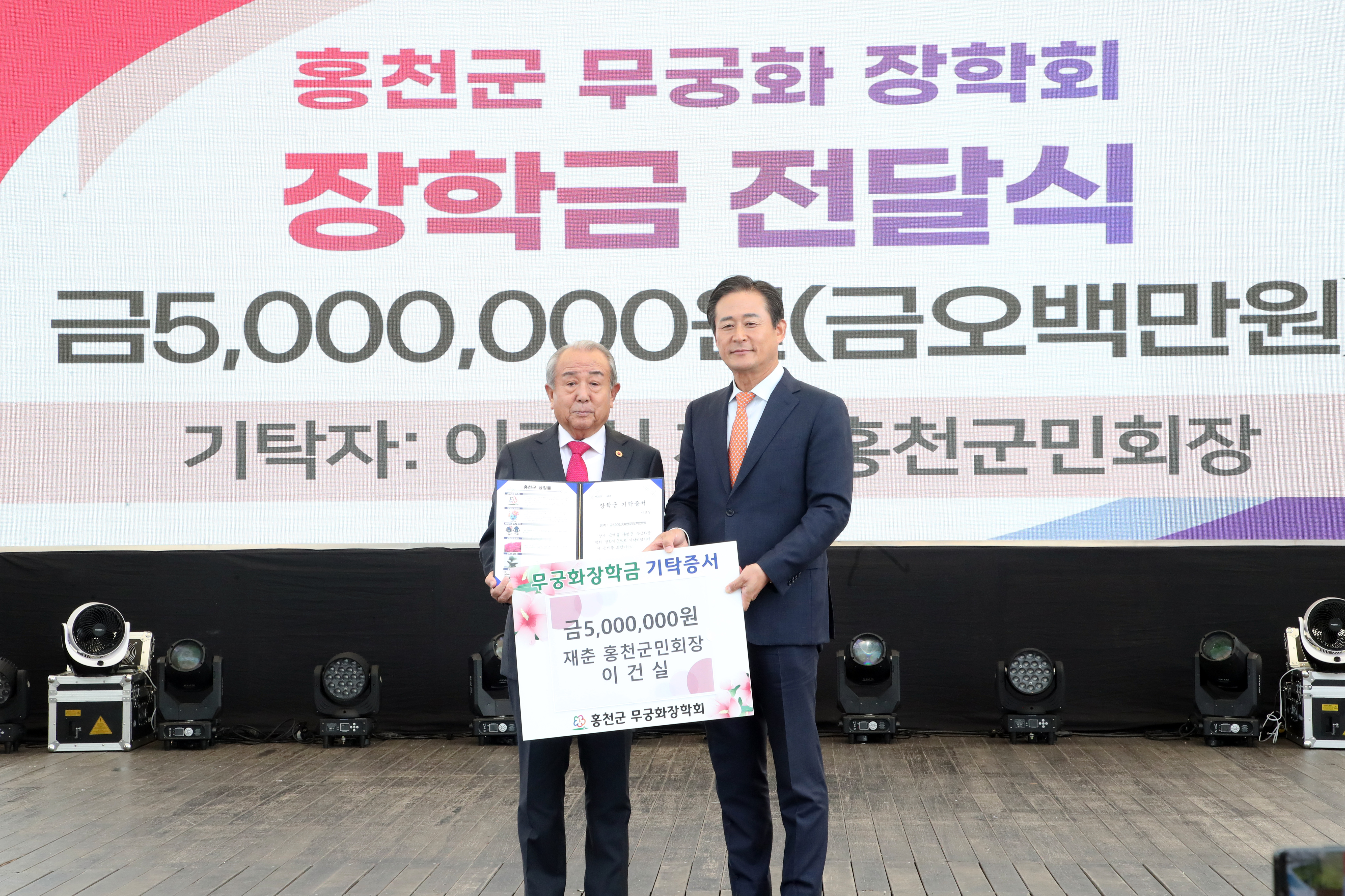 [강원사회복지신문 홍기한 기자]=재춘 홍천군민회 이건실 회장은 지난 10월 6일 오전 10시 제 21회 홍천 인삼, 한우 명품축제장을 방문하여 홍천군 인재육성을 위한 무궁화장학금 500만원을 기탁했다.